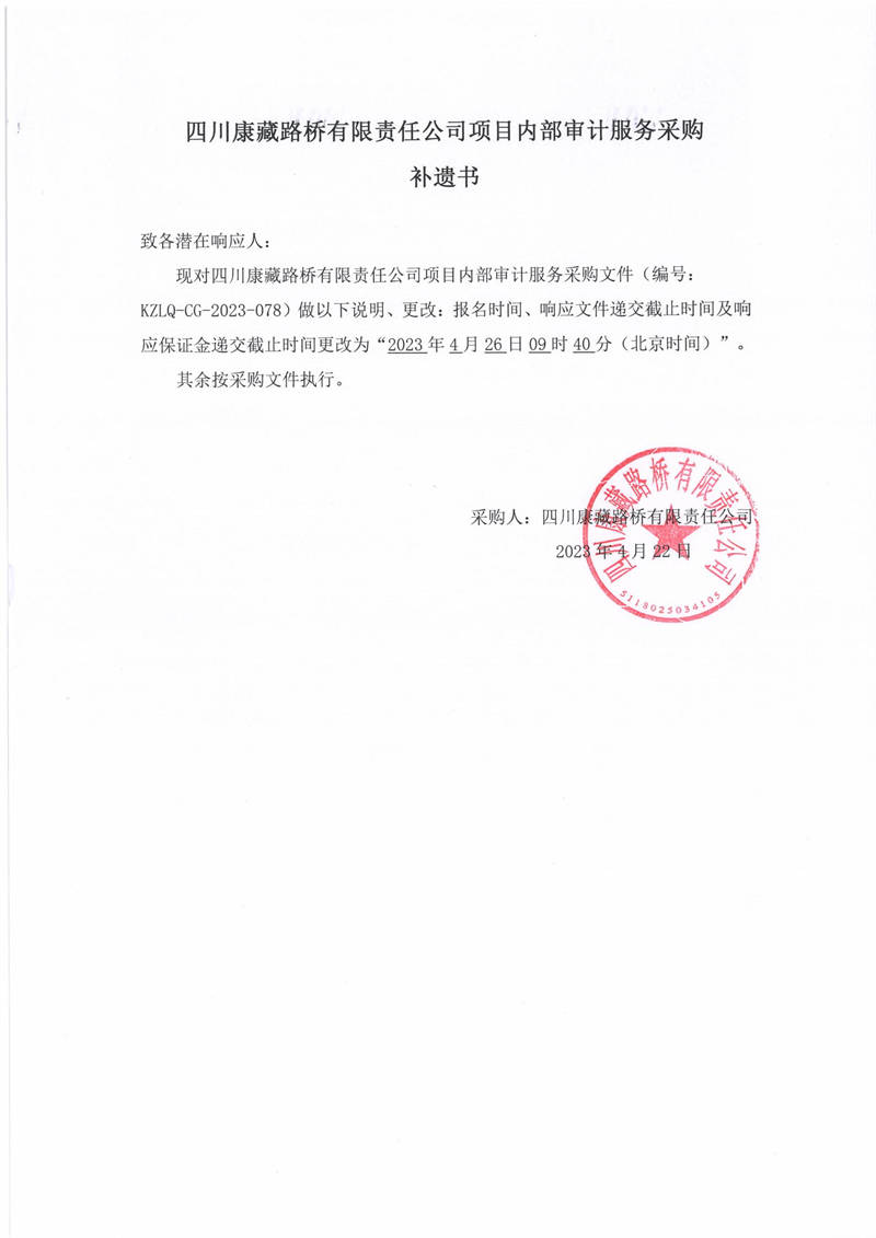 四川康藏路橋有限責任公司項目內部審計服務采購補遺書