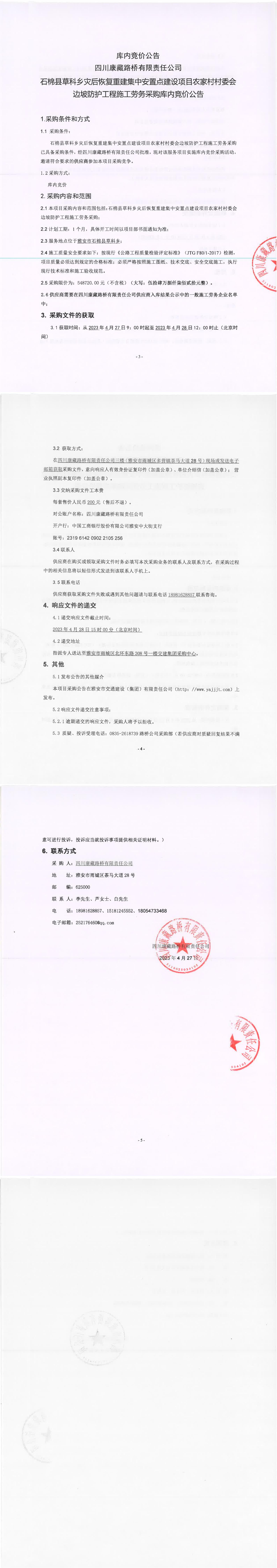 四川康藏路橋有限責(zé)任公司石棉草科鄉(xiāng)災(zāi)后恢復(fù)重建集中安置點(diǎn)建設(shè)項(xiàng)目農(nóng)家村村委會邊坡防護(hù)工程施工勞務(wù)采購采購庫內(nèi)競價公告