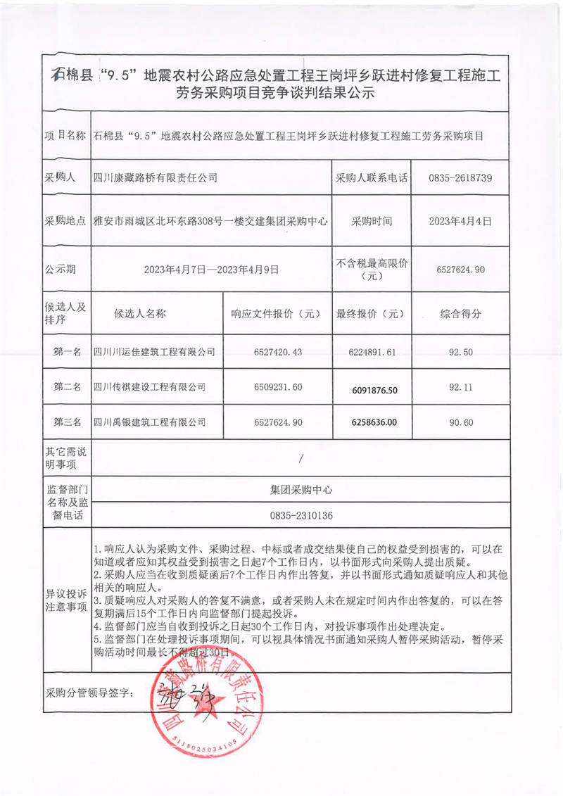 四川康藏路橋有限責(zé)任公司石棉縣“9.5”地震農(nóng)村公路應(yīng)急處置工程王崗坪鄉(xiāng)躍進(jìn)村修復(fù)工程施工勞務(wù)采購項目競爭談判結(jié)果公示