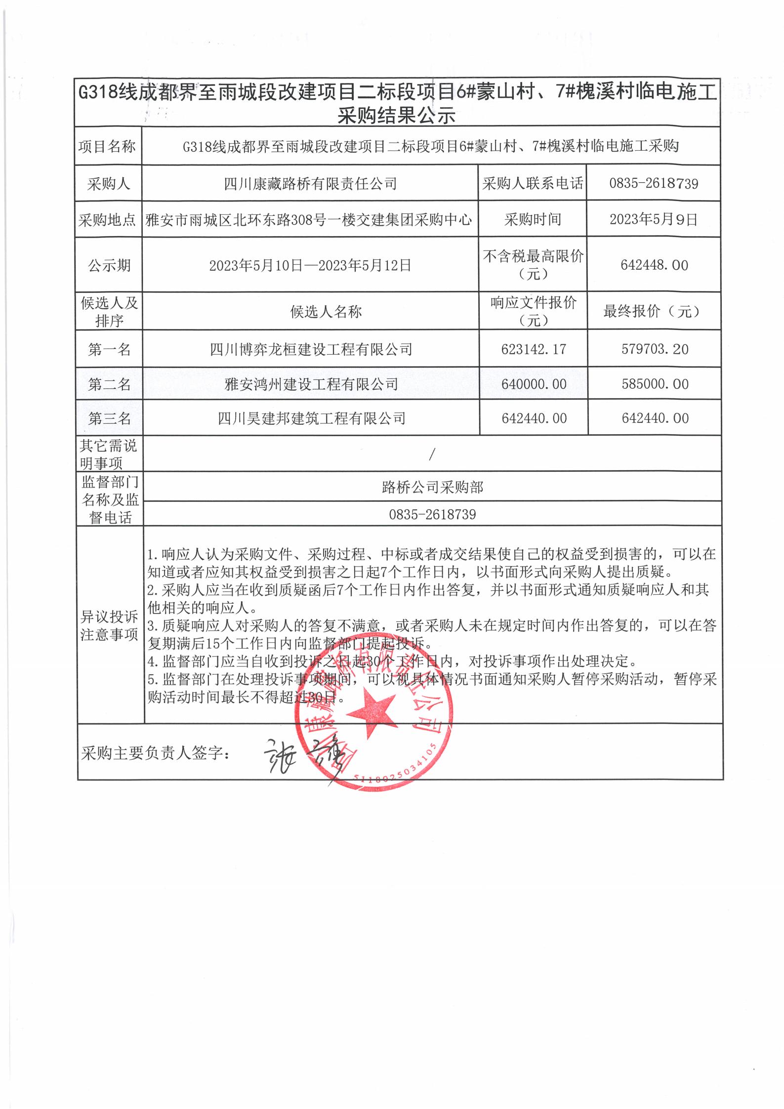 四川康藏路橋有限責(zé)任公司G318線成都至雨城段改建項目二標(biāo)段項目6#蒙山村、7#槐溪村臨時電施工采購結(jié)果公示