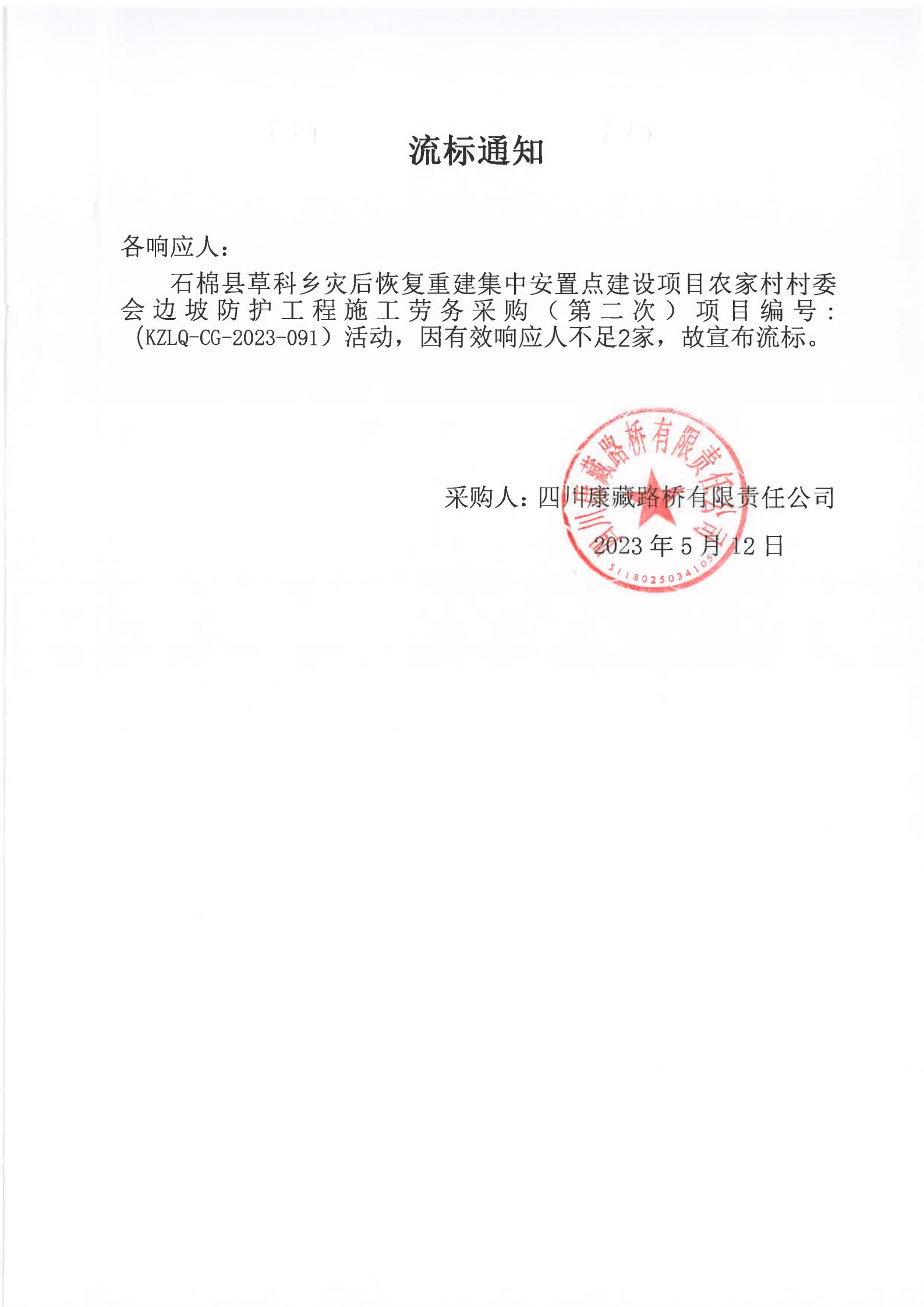 四川康藏路橋有限責(zé)任公司石棉草科鄉(xiāng)集中安置點(diǎn)建設(shè)項(xiàng)目農(nóng)家村村委會(huì)邊坡防護(hù)工程施工勞務(wù)采購(gòu)(第二次)流標(biāo)通知