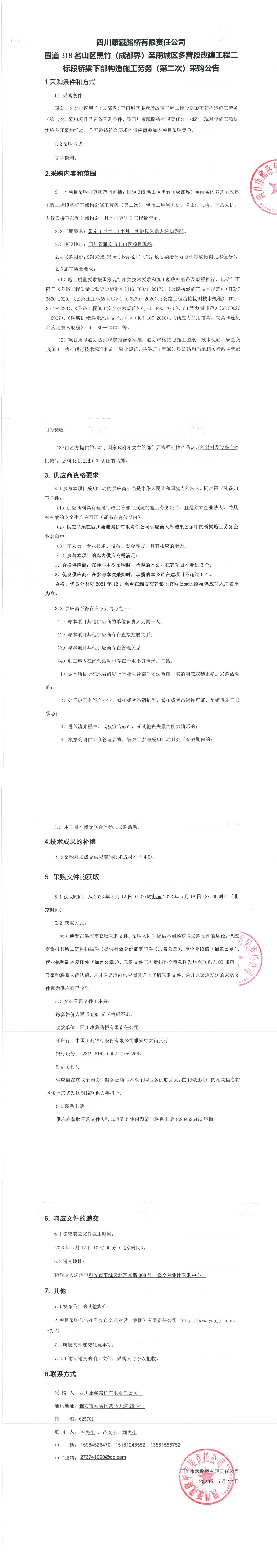 四川康藏路橋有限責(zé)任公司國道318名山區(qū)黑竹(成都界)至雨城區(qū)多營段改建工程二標段橋梁下部構(gòu)造施工勞務(wù)(第二次)采購公告