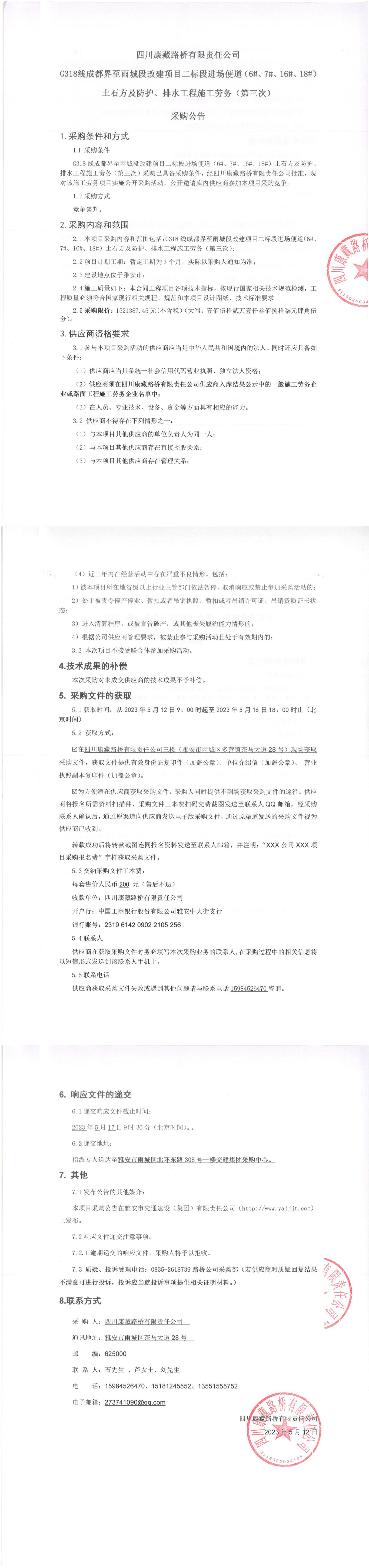 四川康藏路橋有限責(zé)任公司G318線成都至雨城段改建項(xiàng)目二標(biāo)段進(jìn)場(chǎng)便道(6#、7#、16#、18#)土石方及防護(hù)、排水工程施工勞務(wù)(第三次)采購(gòu)公告