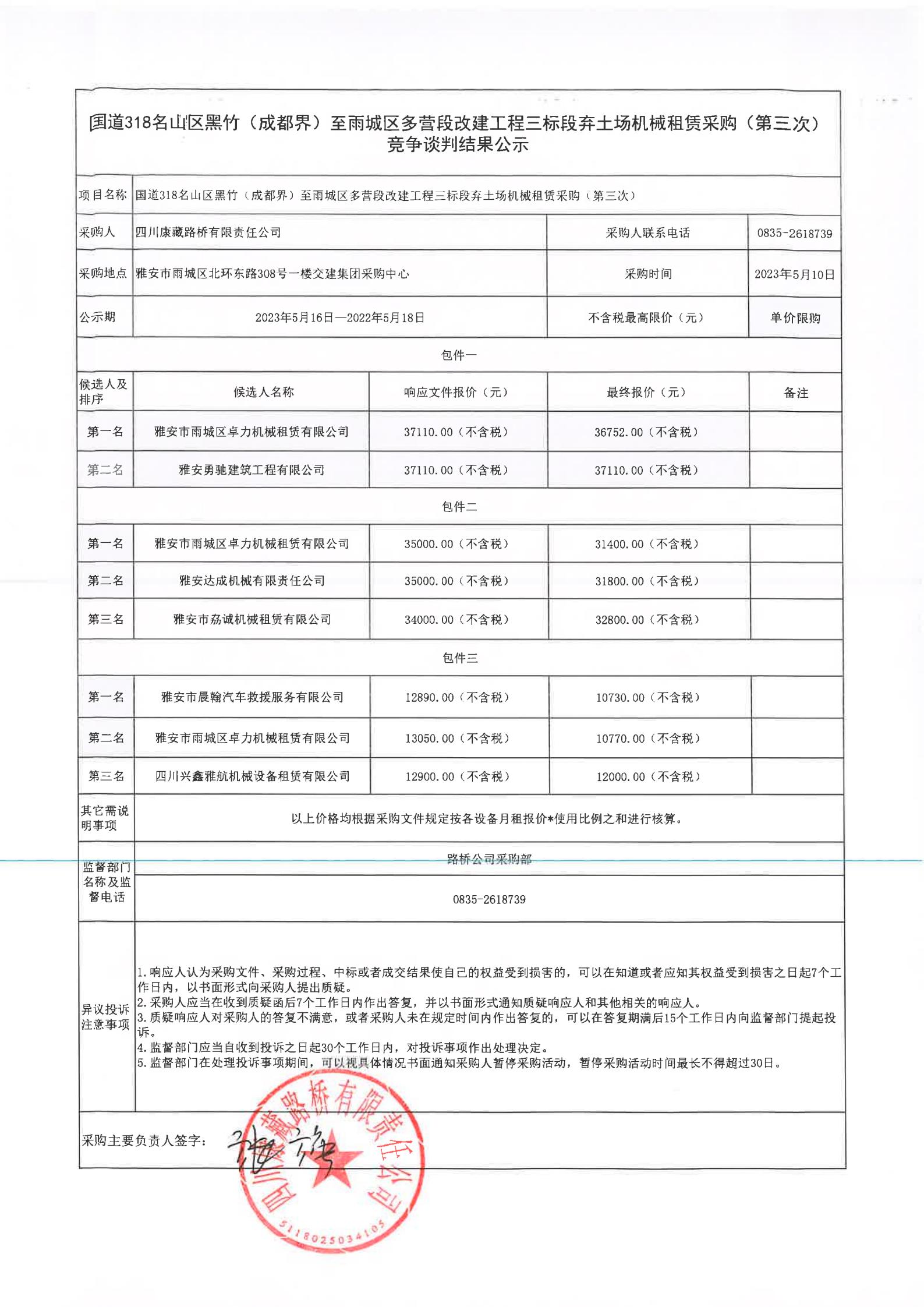 四川康藏路橋有限責(zé)任公司國道318名山區(qū)黑竹(成都界)至雨城區(qū)多營段改建工程三標(biāo)段棄土場機(jī)械租賃采購(第三次)競爭談判結(jié)果公示