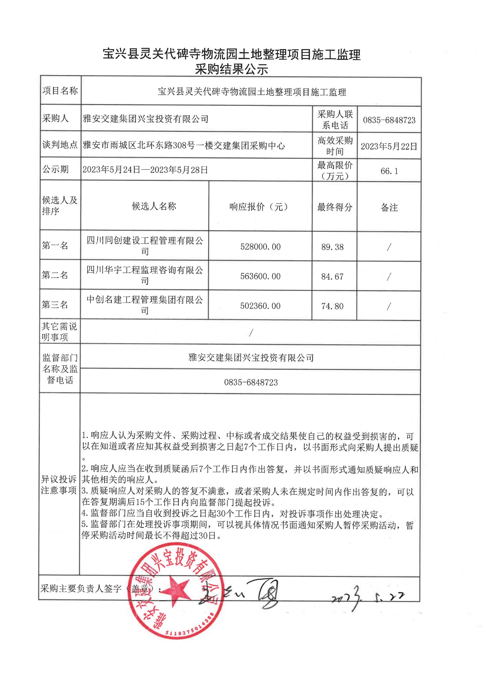 雅安交建集團興寶投資有限公司寶興縣靈關代碑寺物流園土地整理項目施工監(jiān)理采購結果公示