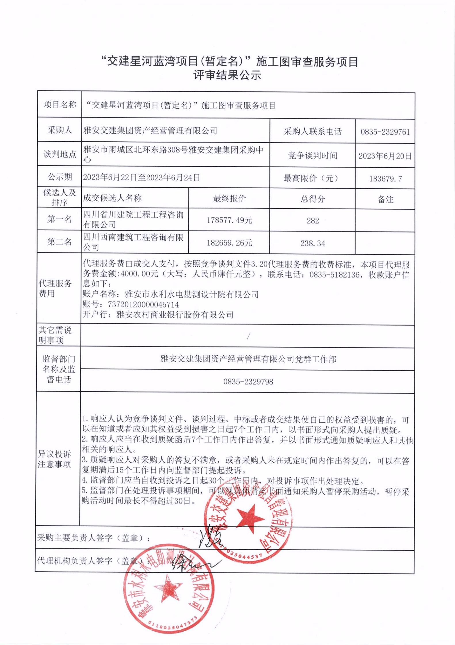 雅安交建集團(tuán)資產(chǎn)經(jīng)營(yíng)管理有限公司“交建星河藍(lán)灣項(xiàng)目(暫定名)”施工圖審查服務(wù)項(xiàng)目評(píng)審結(jié)果公示
