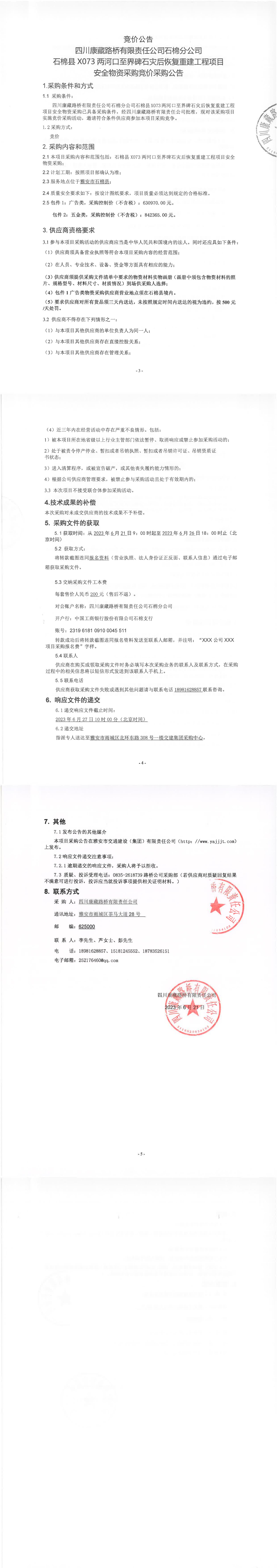 四川康藏路橋有限責(zé)任公司石棉分公司石棉縣X073兩河口至界碑石災(zāi)后恢復(fù)重建工程項(xiàng)目安全物資采購競(jìng)價(jià)公告