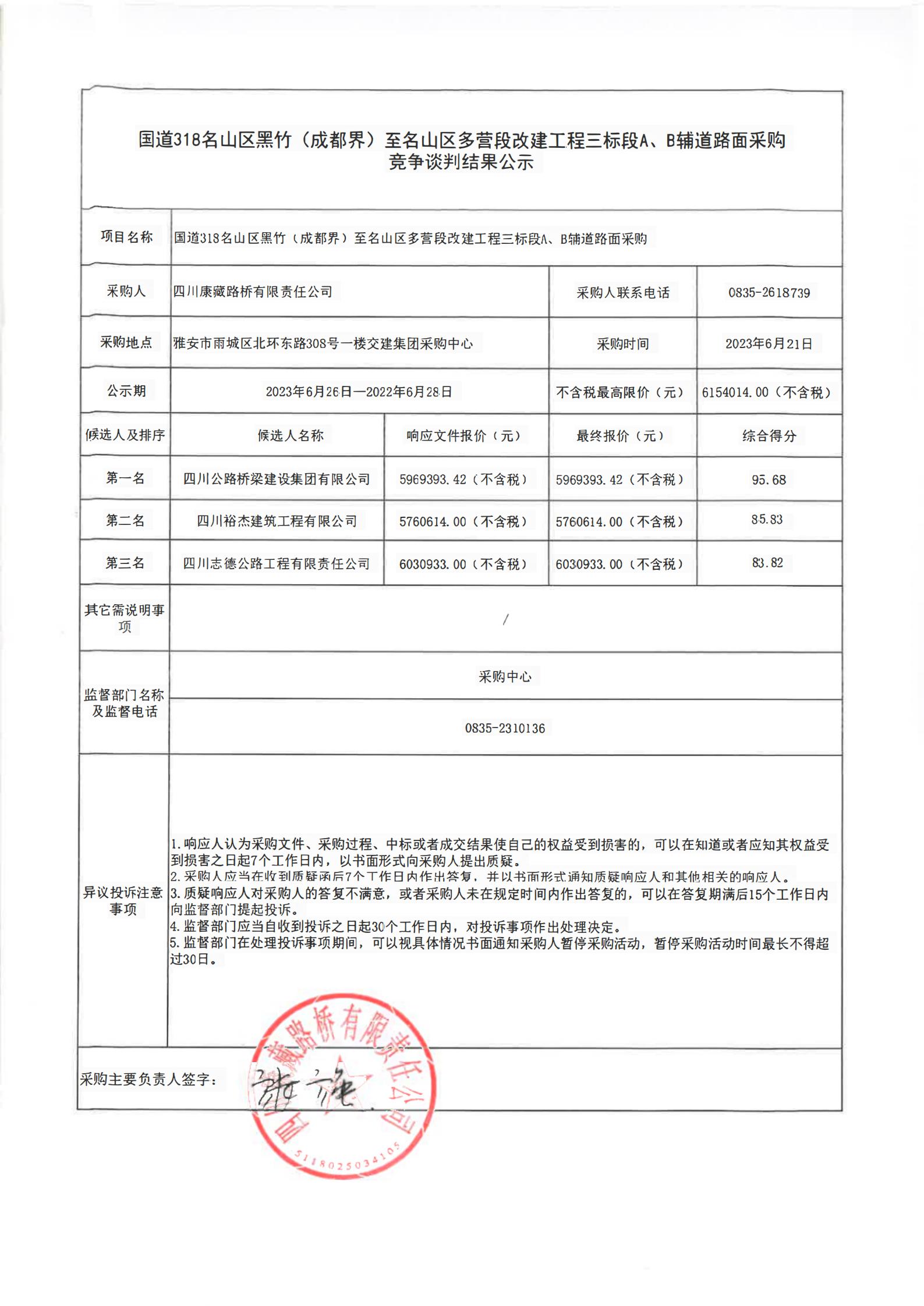 四川康藏路橋有限責(zé)任公司國(guó)道318名山區(qū)黑竹(成都界)至雨城區(qū)多營(yíng)段改建工程三標(biāo)段A、B輔道路面采購(gòu)競(jìng)爭(zhēng)談判結(jié)果公示