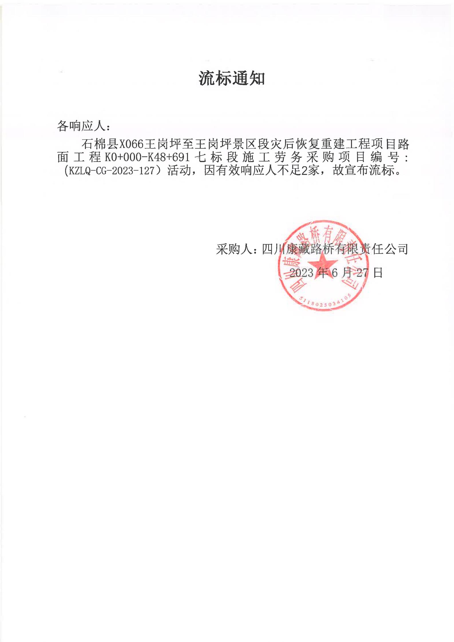 四川康藏路橋有限責(zé)任公司石棉縣X066王崗坪至王崗坪景區(qū)段災(zāi)后恢復(fù)重建工程項目路面工程K0+000-K48+691七標(biāo)段施工勞務(wù)采購流標(biāo)通知