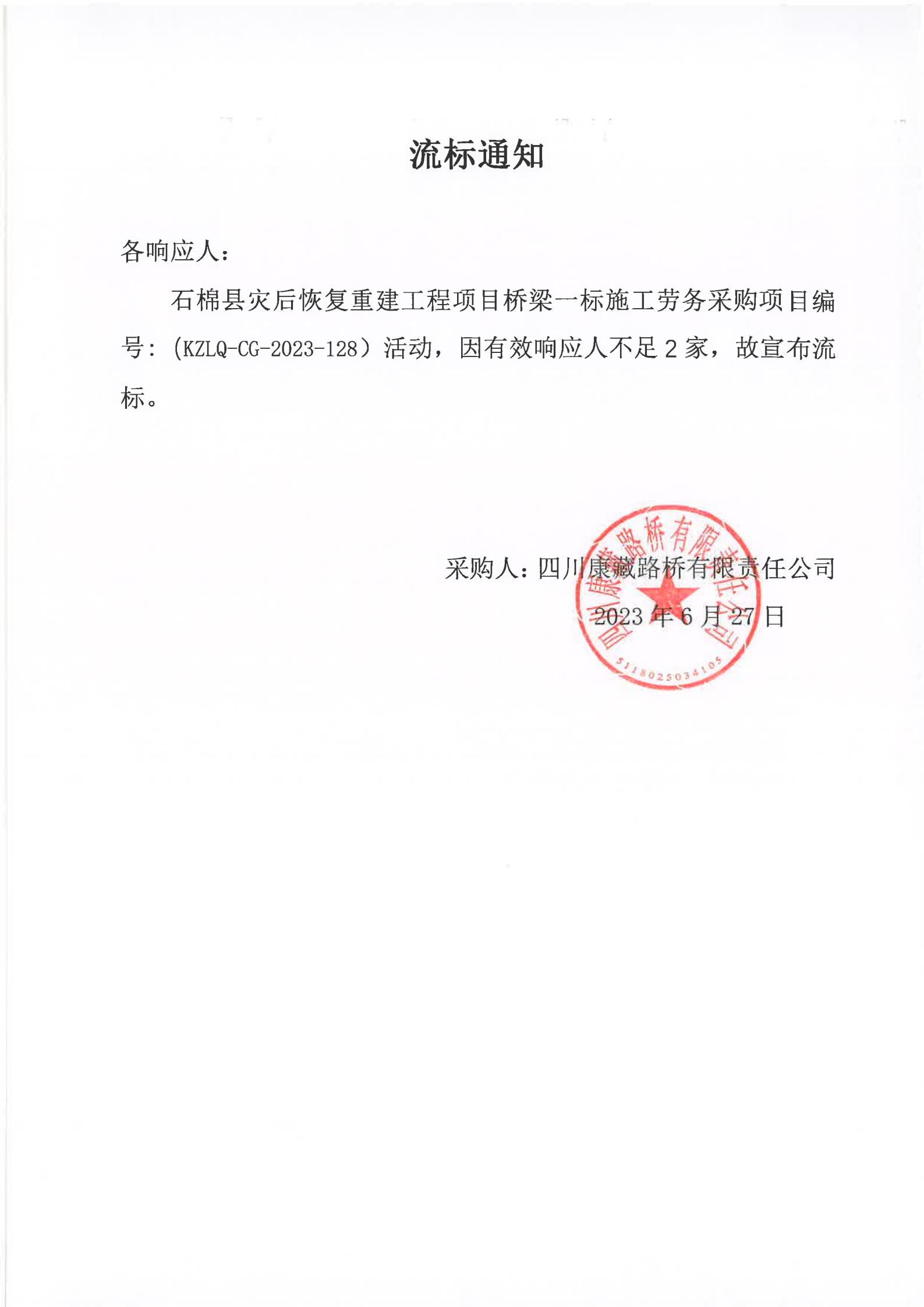 四川康藏路橋有限責(zé)任公司石棉縣災(zāi)后恢復(fù)重建工程項(xiàng)目橋梁一標(biāo)施工勞務(wù)采購流標(biāo)通知