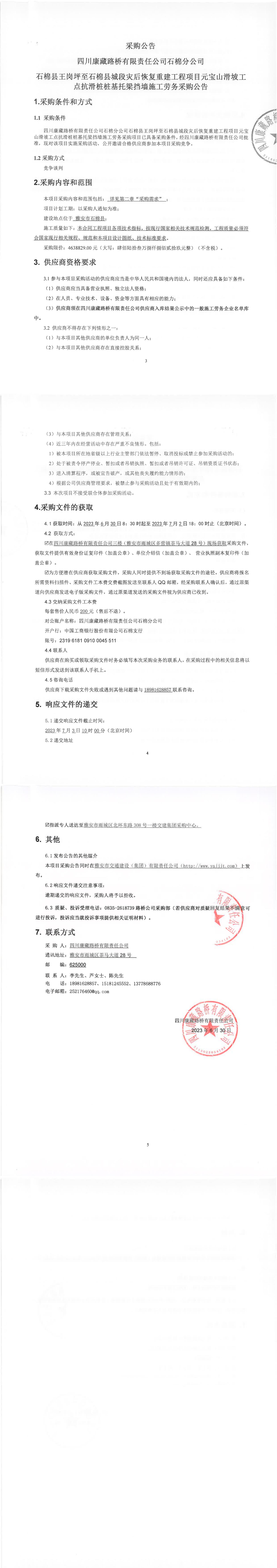 四川康藏路橋有限責任公司石棉縣王崗坪至石棉縣城段災后恢復重建工程項目元寶山滑坡工點抗滑樁樁基托梁擋墻施工勞務采購公告