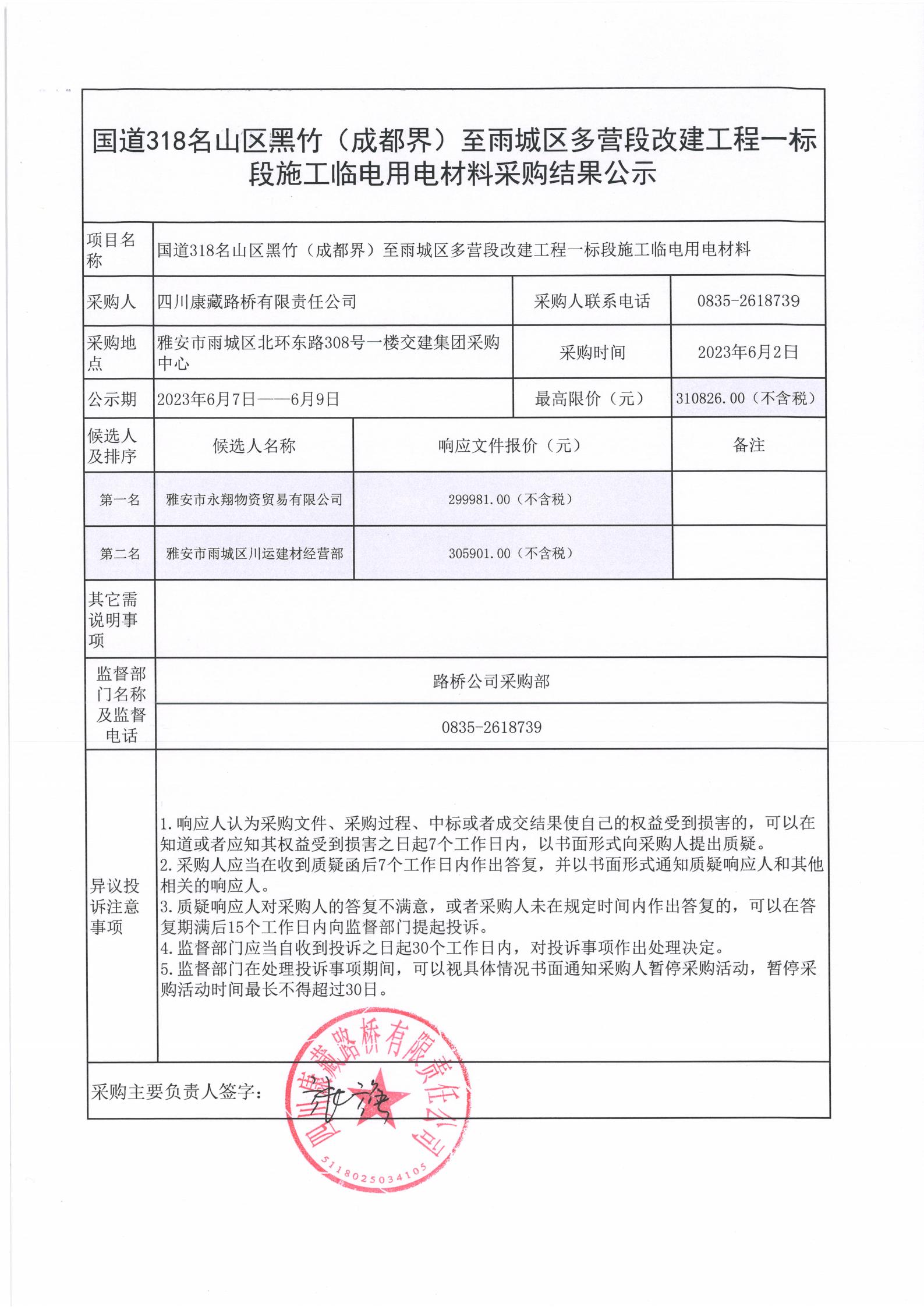 四川康藏路橋有限責(zé)任公司國道318名山區(qū)黑竹(成都界)至雨城區(qū)多營段改建工程一標(biāo)段施工臨電用電材料采購結(jié)果公示