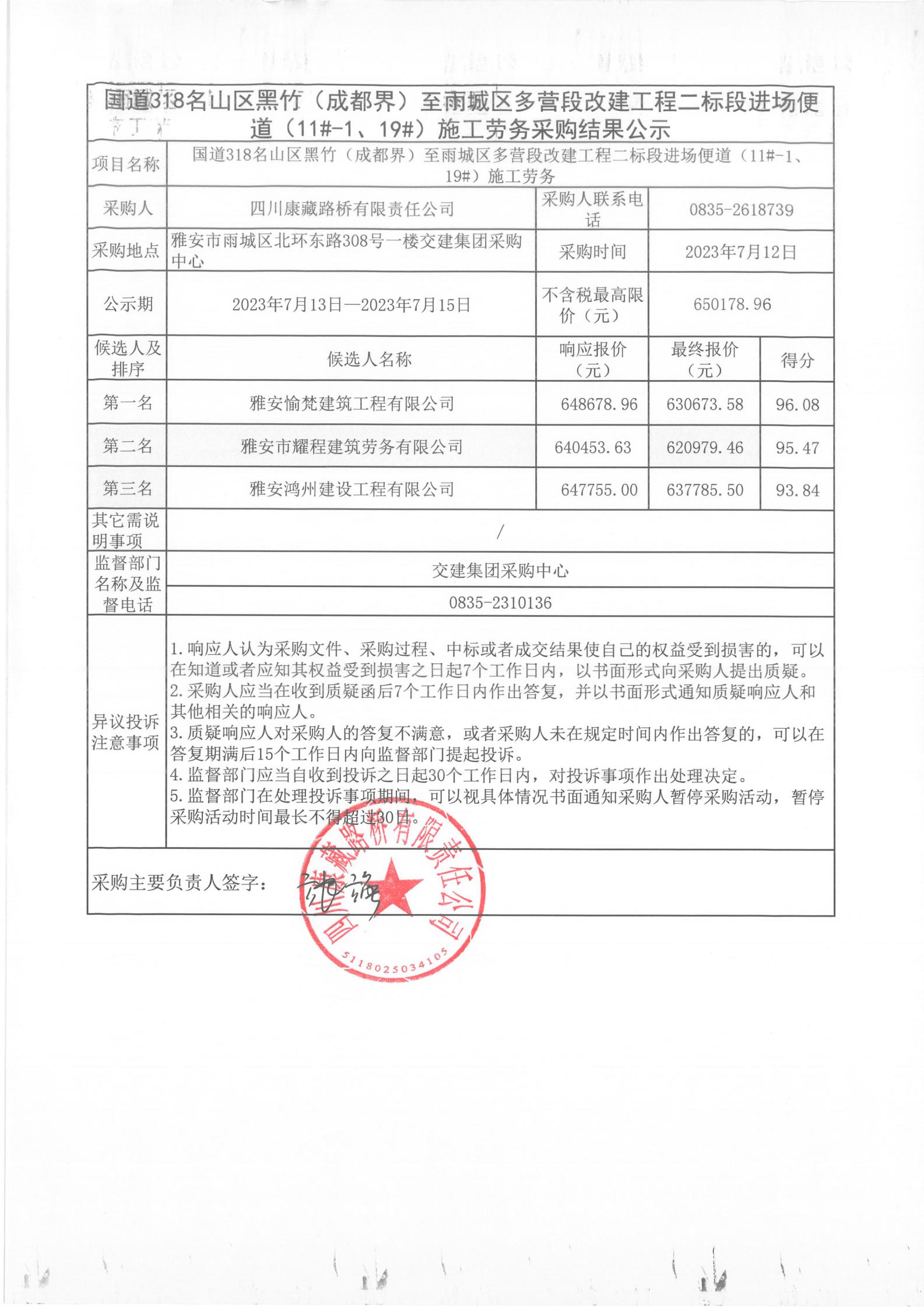 四川康藏路橋有限責任公司國道318名山區(qū)黑竹(成都界)至雨城區(qū)多營段改建工程二標段進場便道(11#-1、19#)施工勞務采購結(jié)果公示