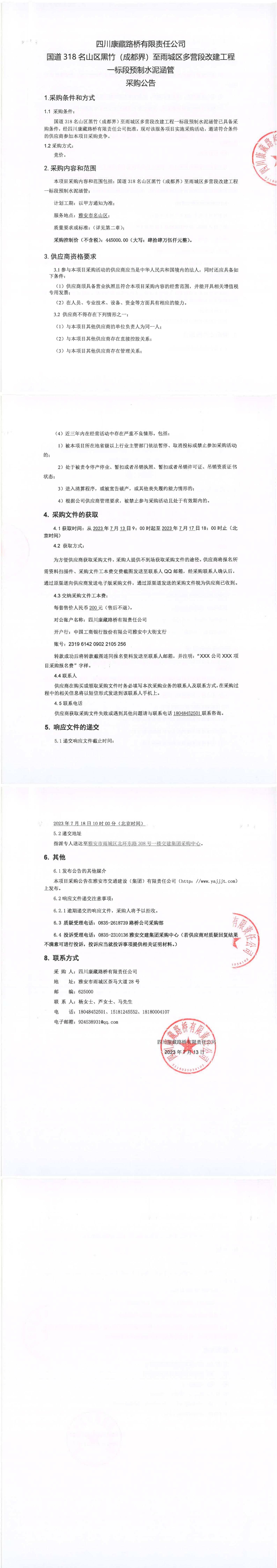 四川康藏路橋有限責任公司國道318名山區(qū)黑竹(成都界)至雨城區(qū)多營段改建工程一標段預制水泥涵管采購公告