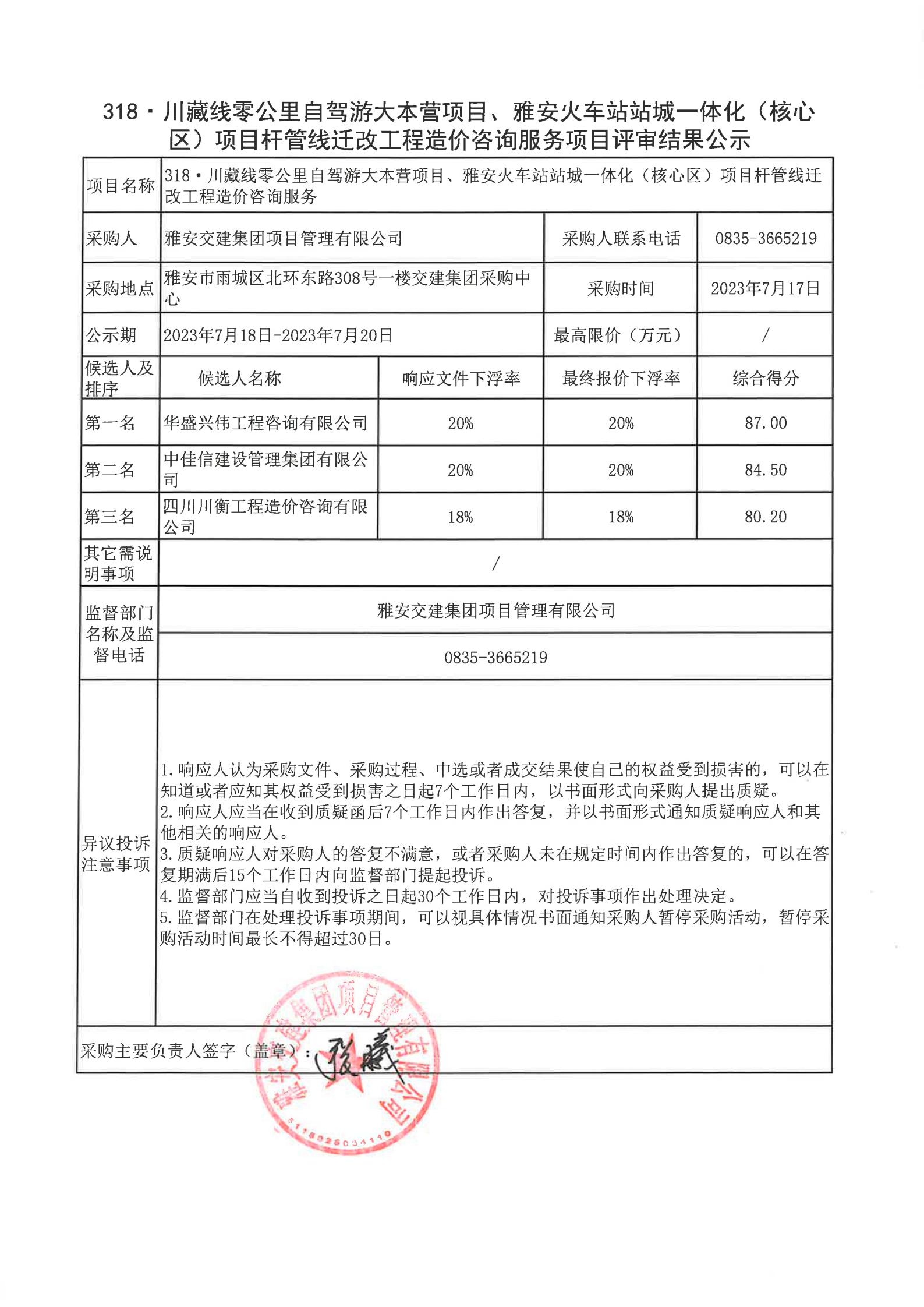 雅安交建集團(tuán)項(xiàng)目管理有限公司318·川藏公路零公里自駕游大本營項(xiàng)目、雅安火車站站城一體化(核心區(qū))項(xiàng)目桿管線遷改工程造價咨詢服務(wù)項(xiàng)目評審結(jié)果公示