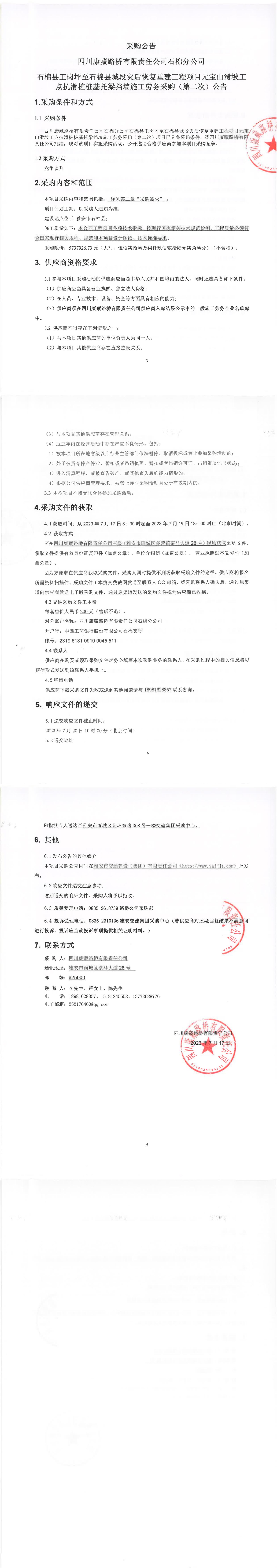 四川康藏路橋有限責(zé)任公司石棉分公司石棉縣王崗坪至石棉縣城段災(zāi)后恢復(fù)重建工程項(xiàng)目元寶山滑坡工點(diǎn)抗滑樁樁基托梁擋墻施工勞務(wù)采購(gòu)(第二次)公告