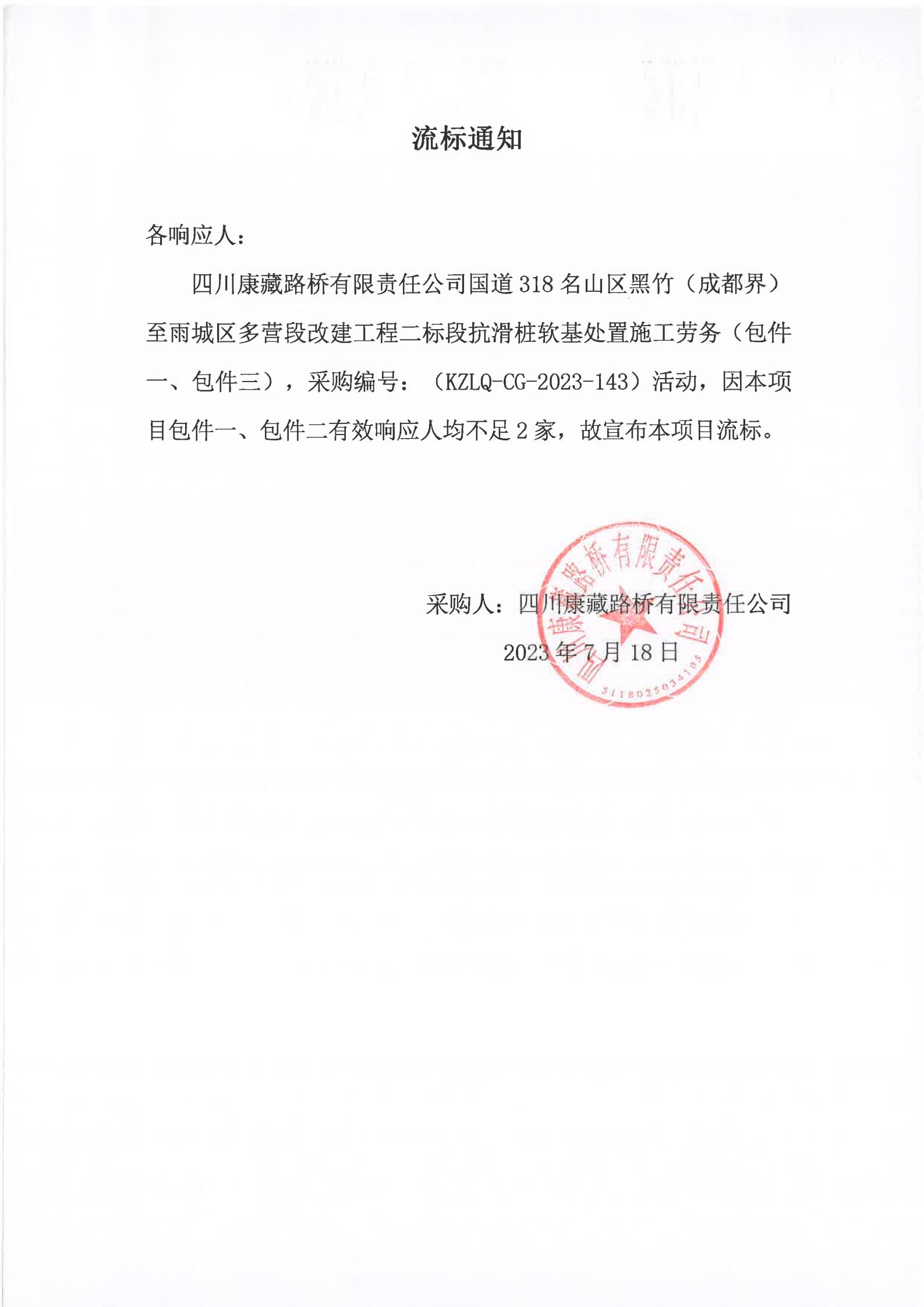 四川康藏路橋有限責(zé)任公司國道318名山區(qū)黑竹(成都界)至雨城區(qū)多營段改建工程二標段抗滑樁軟基處置施工勞務(wù)(包件一、包件三)流標通知