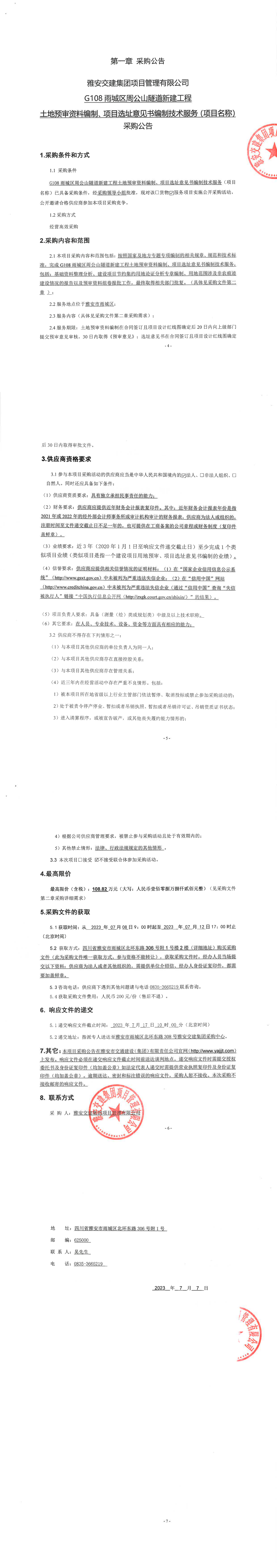 雅安交建集團項目管理有限公司G108雨城區(qū)周公山隧道新建工程土地預審資料編制、項目選址意見書編制技術(shù)服務(項目名稱)采購公告