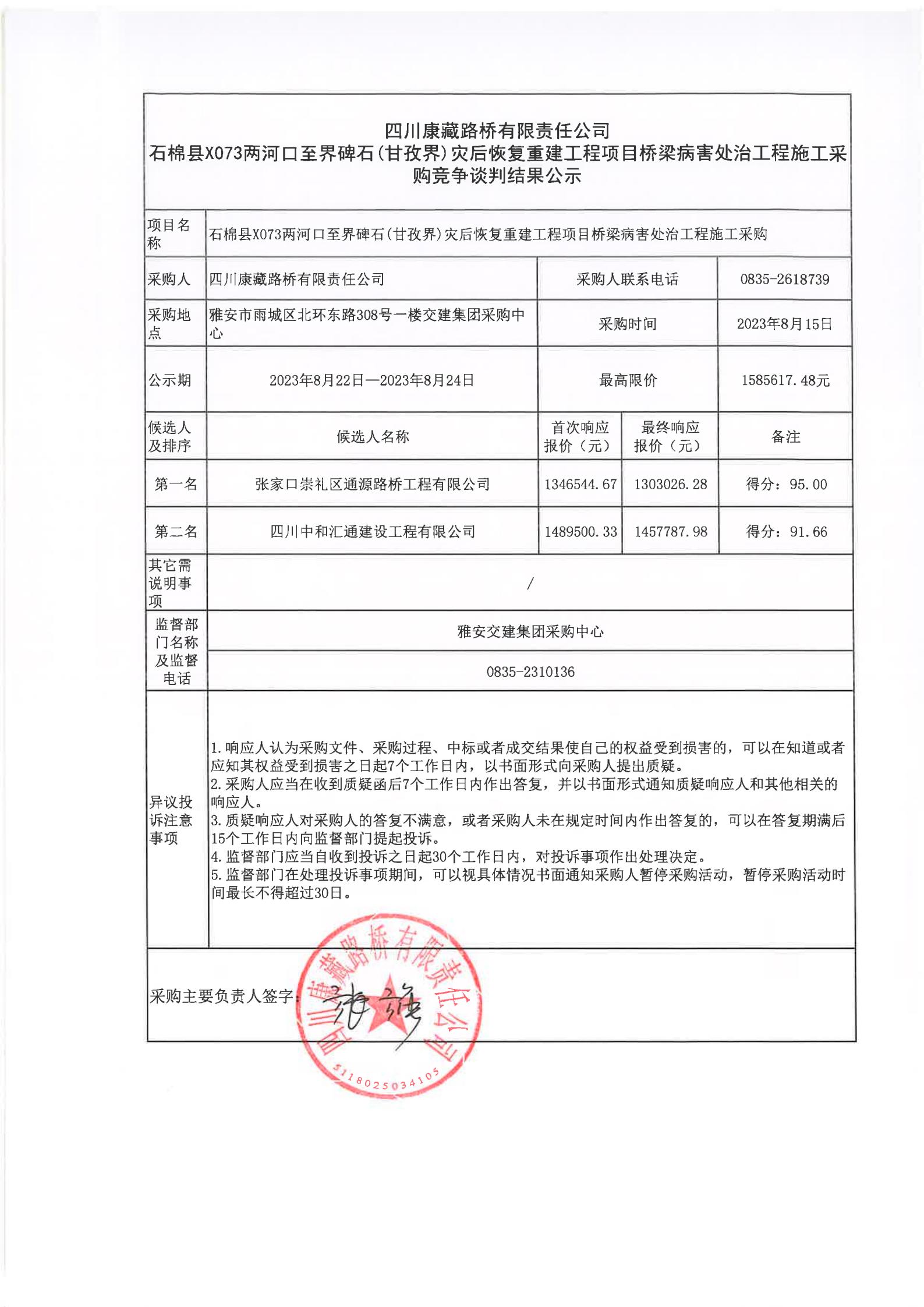 四川康藏路橋有限責(zé)任公司石棉縣X073兩河口至界碑石(甘孜界)災(zāi)后恢復(fù)重建工程項(xiàng)目橋梁病害處治工程施工采購(gòu)競(jìng)爭(zhēng)談判結(jié)果公示