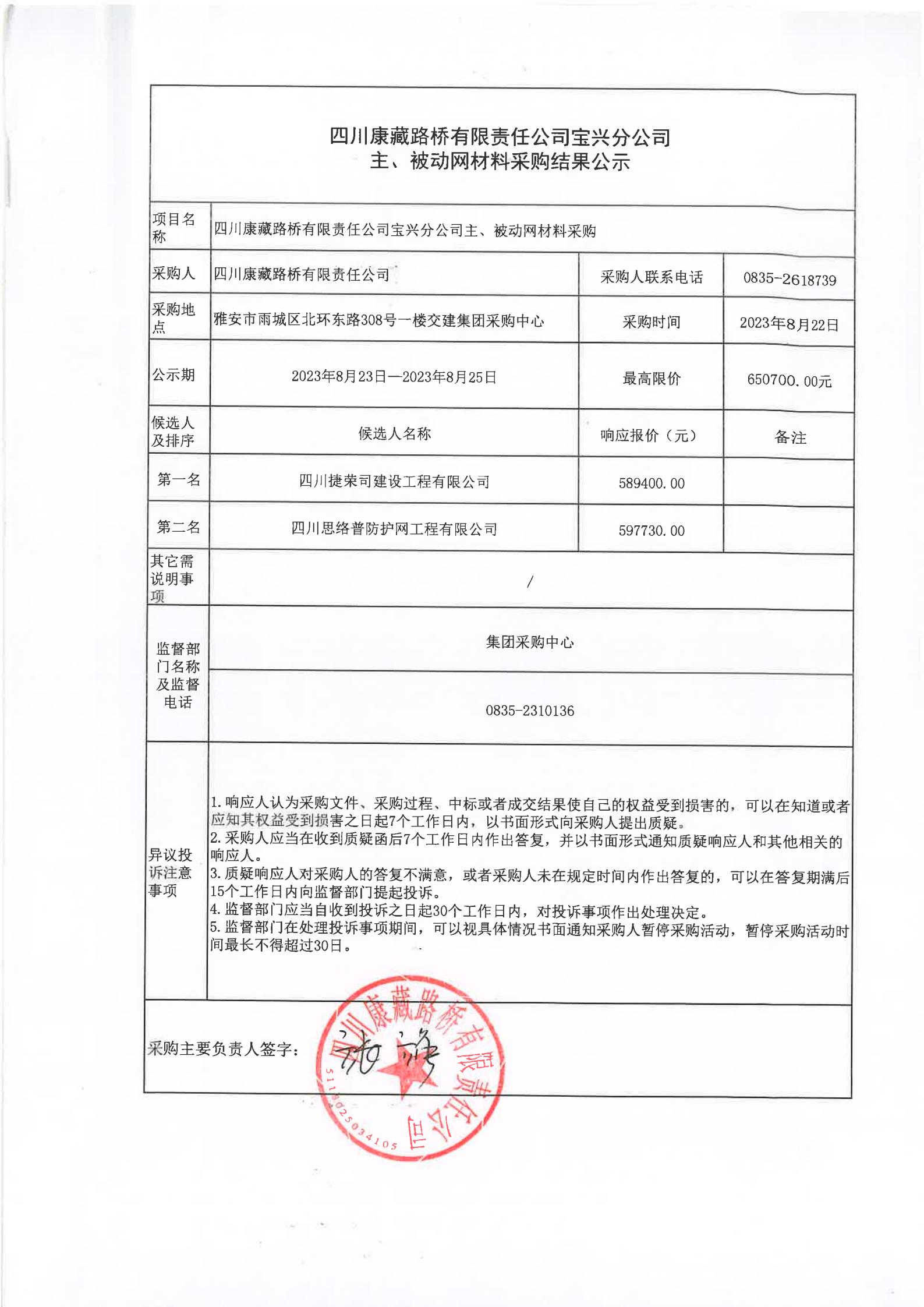 四川康藏路橋有限責任公司寶興分公司主、被動網(wǎng)材料采購結(jié)果公示