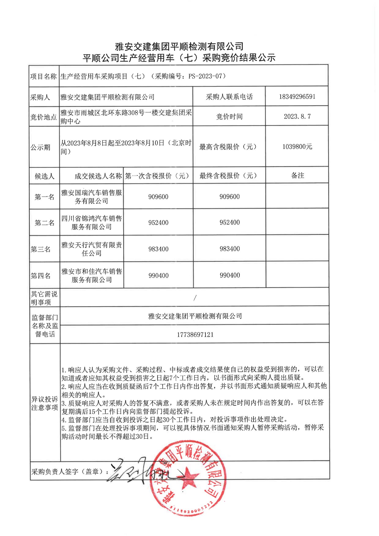 雅安交建集團(tuán)平順檢測(cè)有限公司平順公司生產(chǎn)經(jīng)營(yíng)用車(七)采購(gòu)競(jìng)價(jià)結(jié)果公示