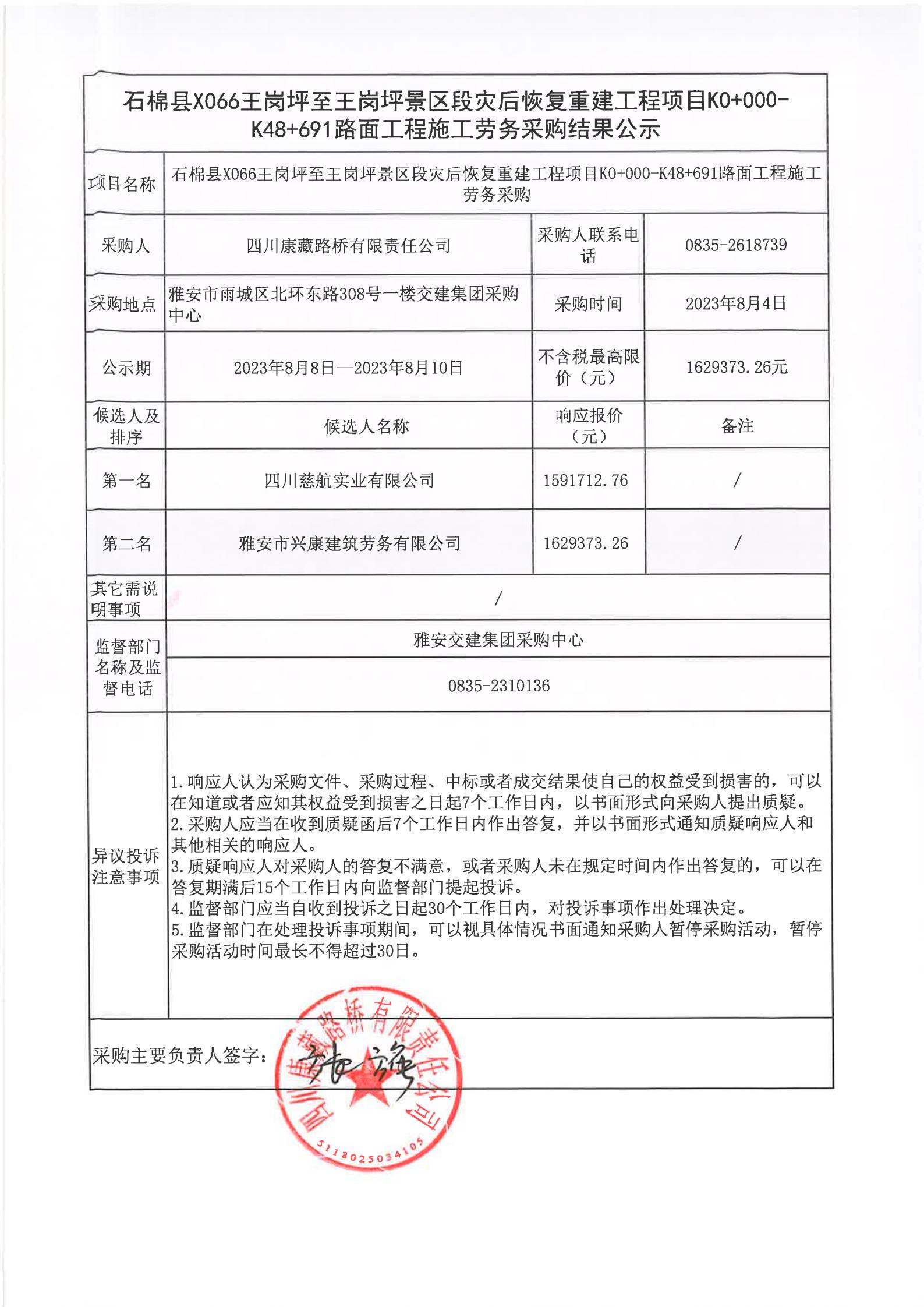 四川康藏路橋有限責(zé)任公司石棉縣X066王崗坪至王崗坪景區(qū)段災(zāi)后恢復(fù)重建工程項(xiàng)目K0+000-K48+691路面工程施工勞務(wù)采購結(jié)果公示