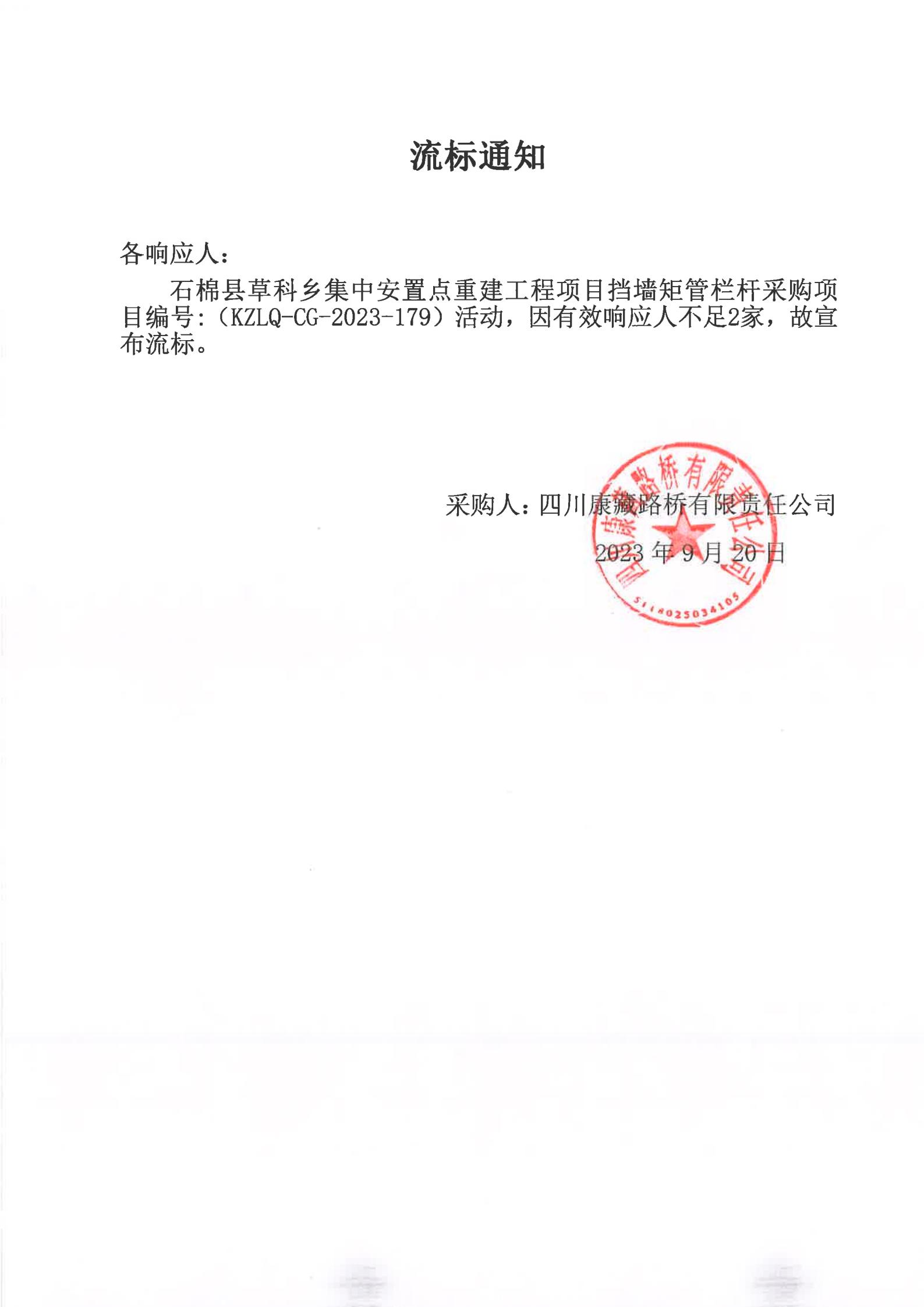 四川康藏路橋有限責(zé)任公司石棉草科鄉(xiāng)集中安置點重建工程項目擋墻矩管欄桿采購項目流標(biāo)通知