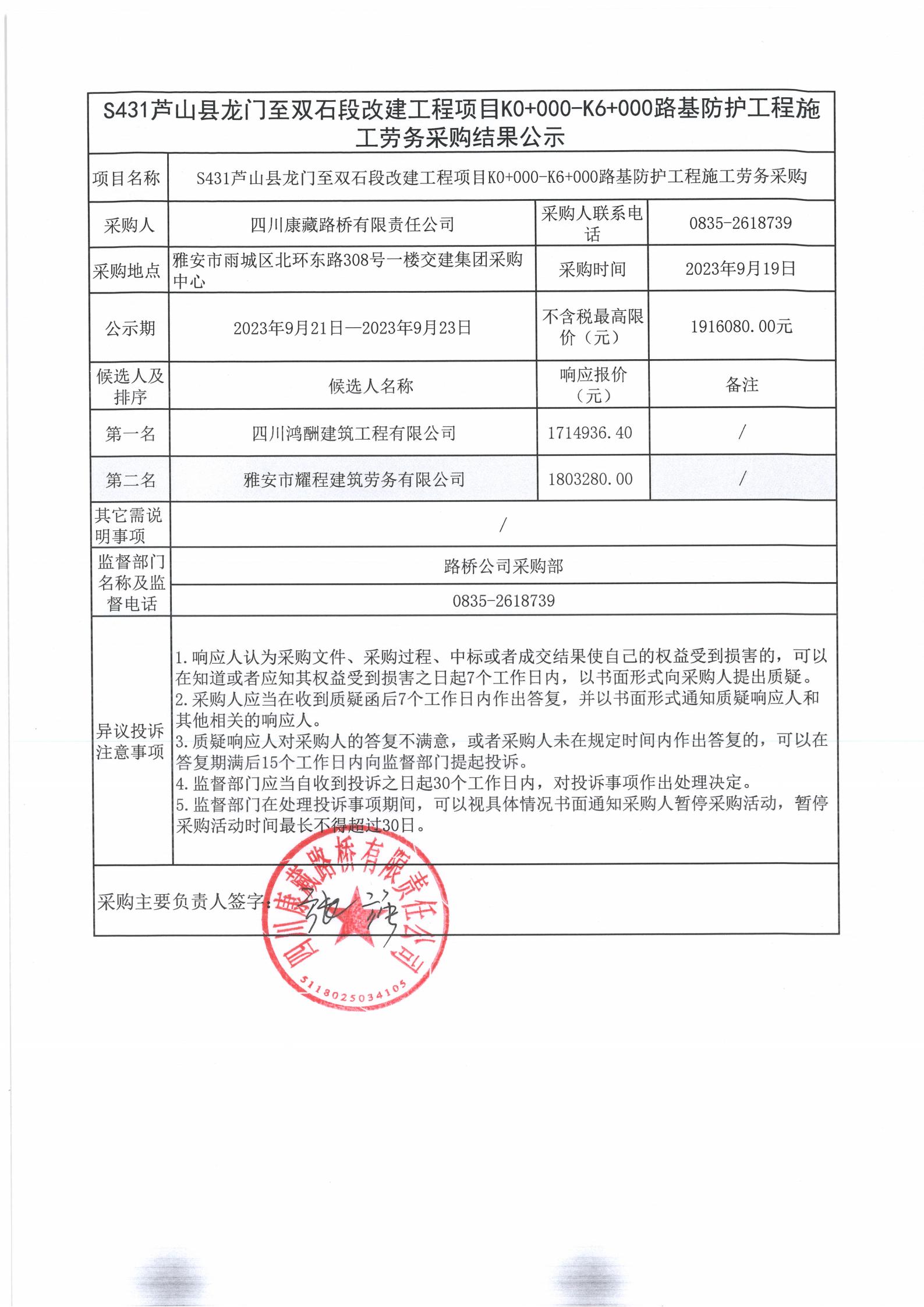 四川康藏路橋有限責(zé)任公司S431蘆山縣龍門至雙石段改建工程項(xiàng)目K0+000-K6+000路基防護(hù)工程施工勞務(wù)采購結(jié)果公示
