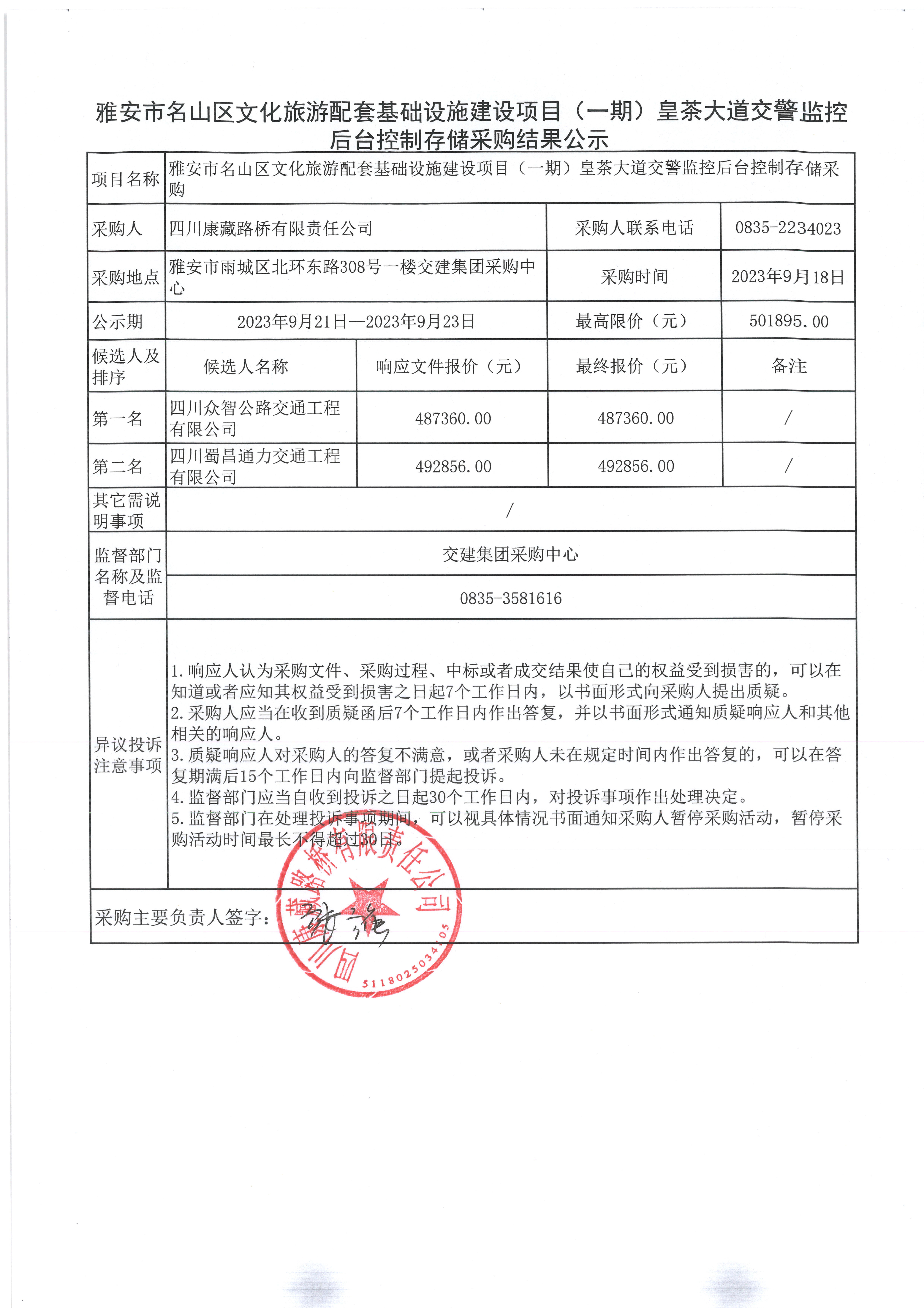 四川康藏路橋有限責(zé)任公司雅安市名山區(qū)文化旅游配套基礎(chǔ)設(shè)施建設(shè)項(xiàng)目(一期)皇茶大道交警監(jiān)控后臺(tái)控制存儲(chǔ)采購結(jié)果公示