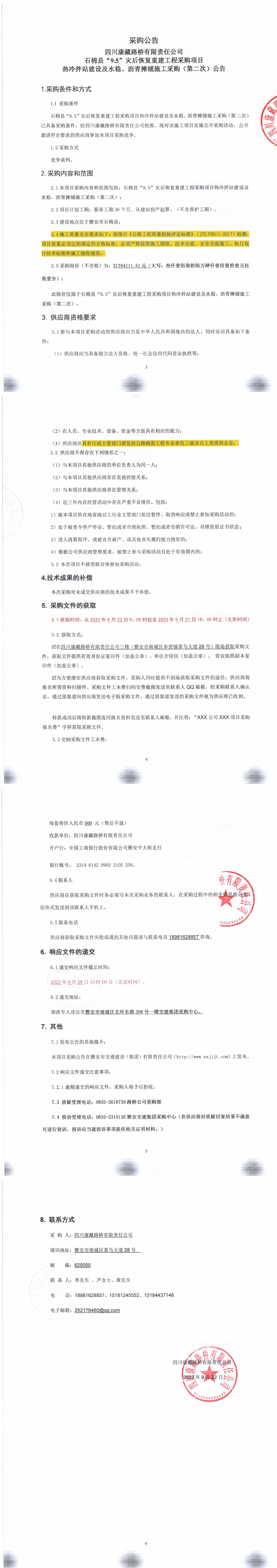 四川康藏路橋有限責(zé)任公司石棉縣“9·5”災(zāi)后恢復(fù)重建工程采購(gòu)項(xiàng)目熱冷拌站建設(shè)及水穩(wěn)、瀝青攤鋪施工采購(gòu)(第二次)公告