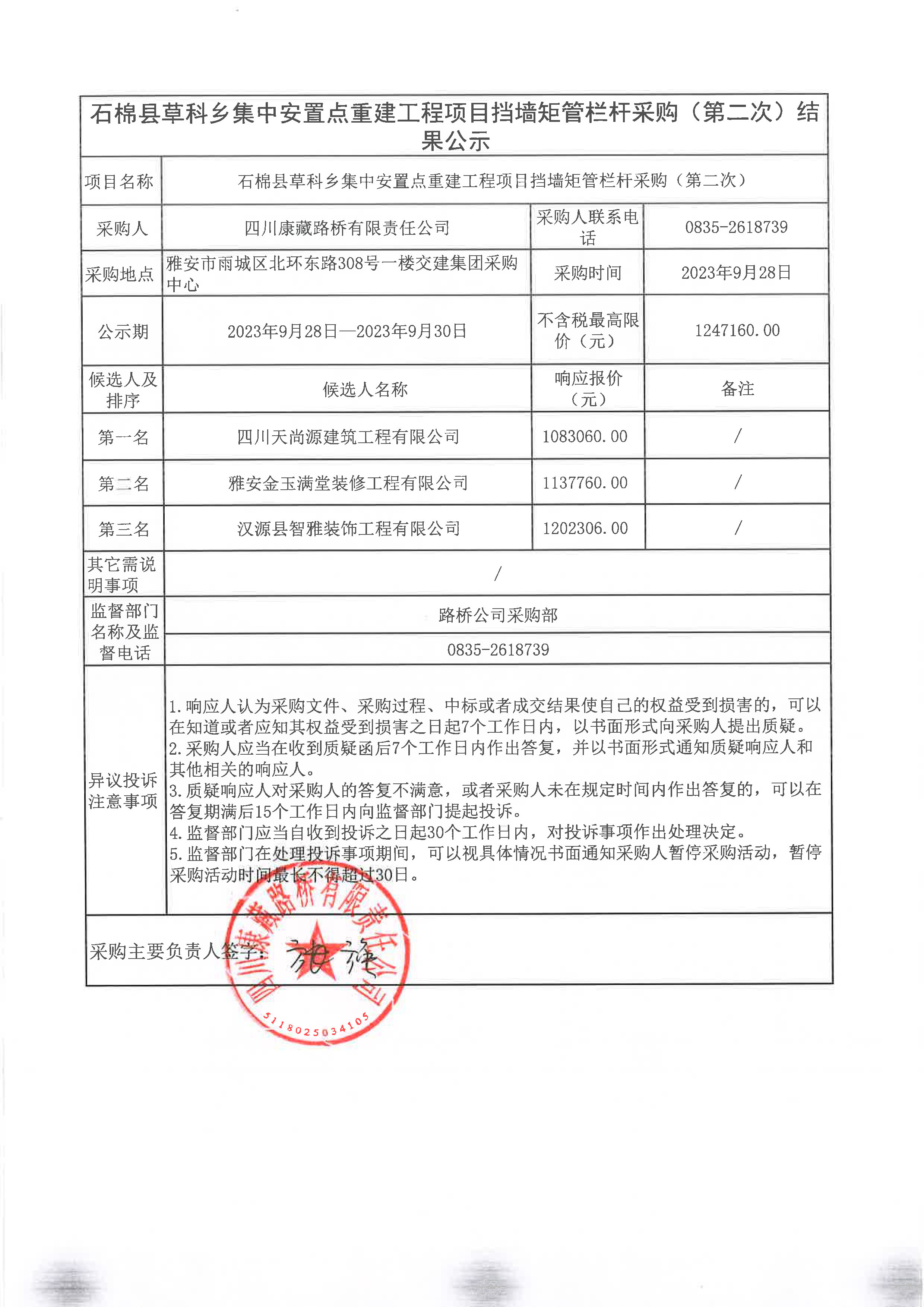 四川康藏路橋有限責(zé)任公司石棉縣草科鄉(xiāng)集中安置點重建工程項目擋墻矩管欄桿采購(第二次)結(jié)果公示