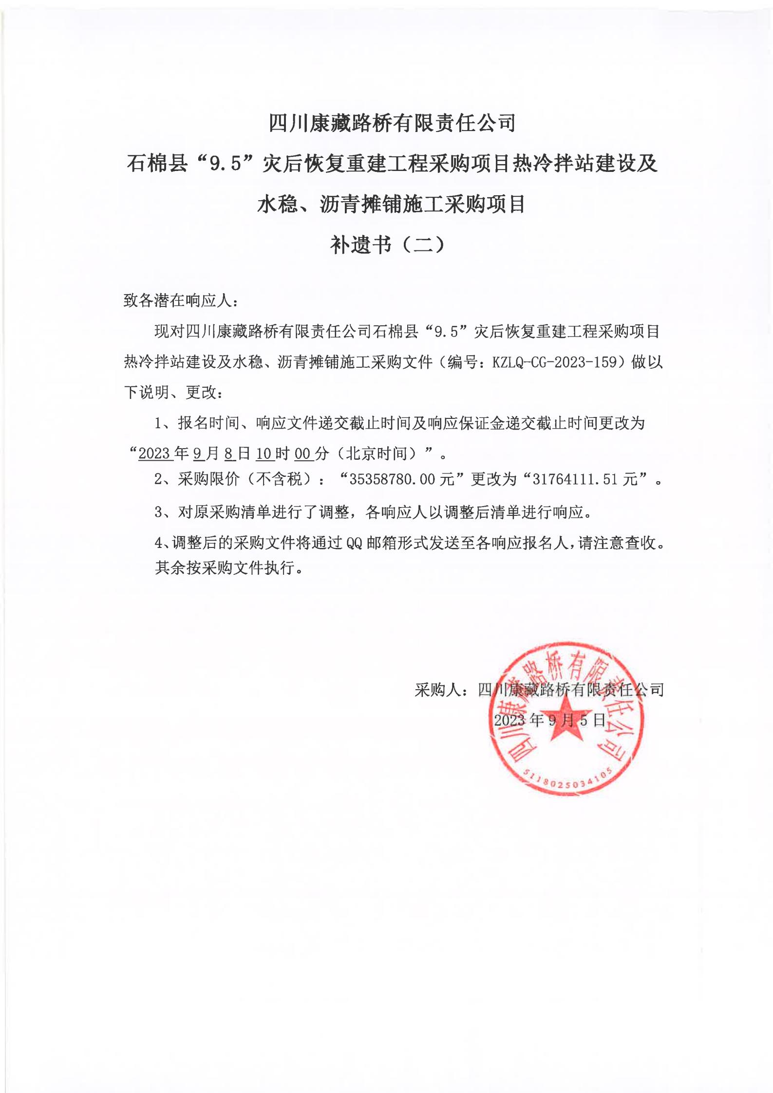 四川康藏路橋有限責(zé)任公司石棉縣“9·5”災(zāi)后恢復(fù)重建工程采購(gòu)項(xiàng)目熱冷拌站建設(shè)及水穩(wěn)、瀝青攤鋪施工采購(gòu)項(xiàng)目補(bǔ)遺書(shū)(二)