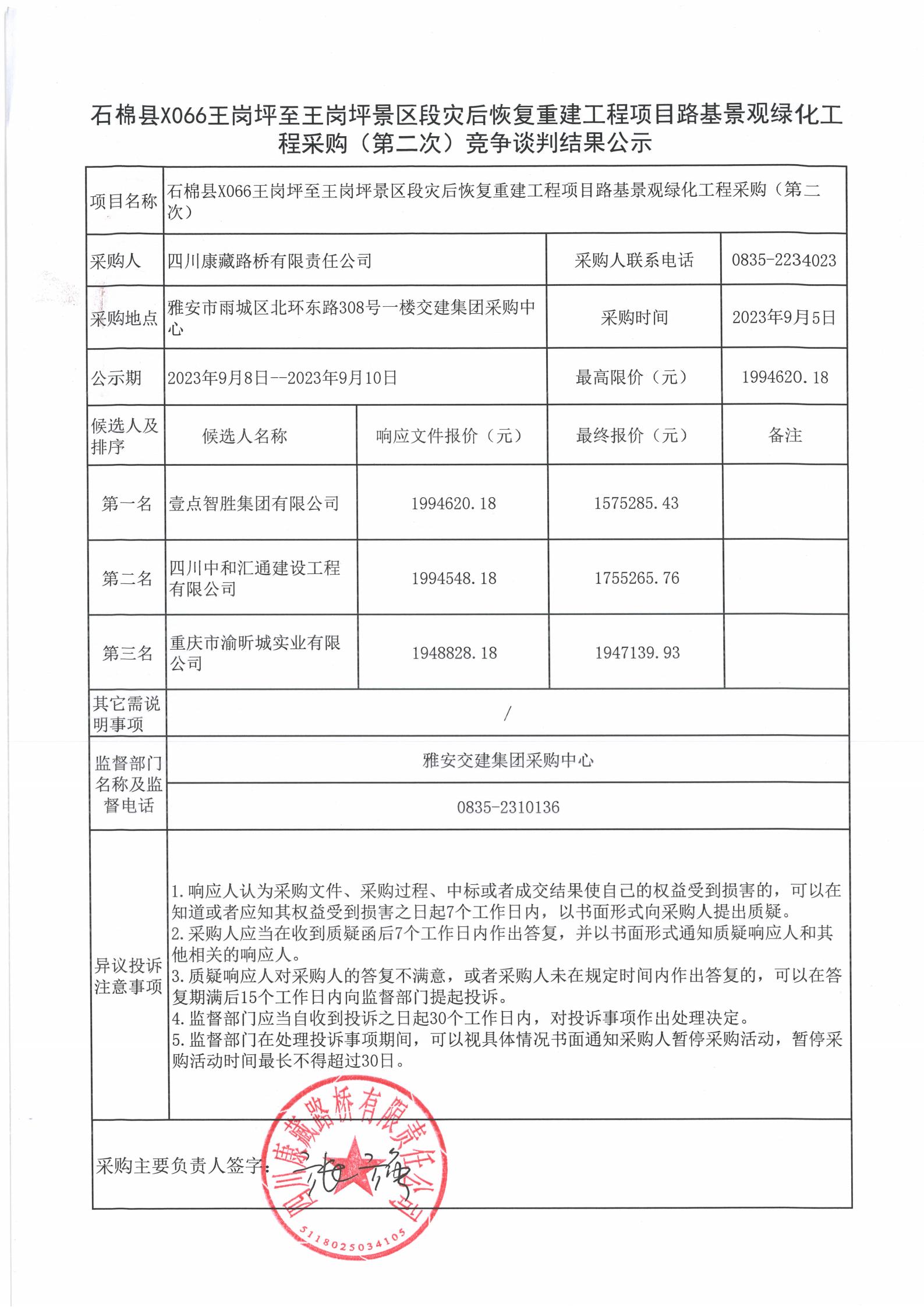 四川康藏路橋有限責(zé)任公司石棉縣X066王崗坪至王崗坪景區(qū)段災(zāi)后恢復(fù)重建工程項目路基景觀綠化工程施工采購(第二次)競爭談判結(jié)果公示