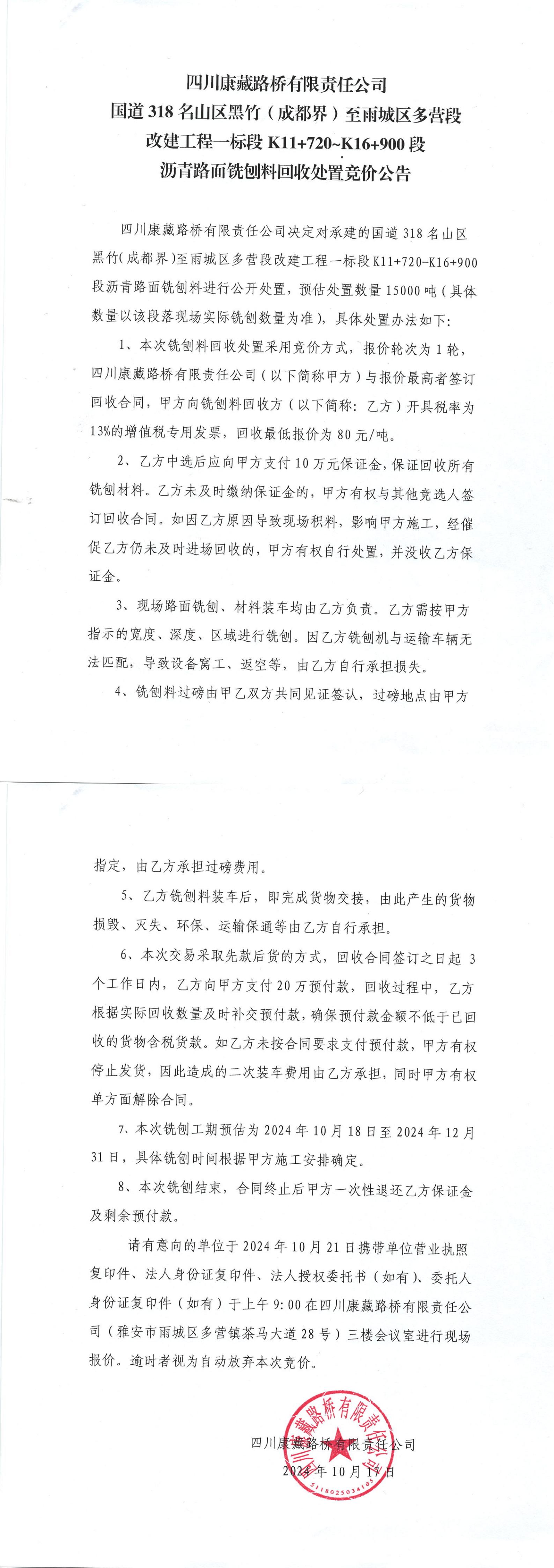 四川康藏路橋有限責(zé)任公司國道318名山區(qū)黑竹(成都界)至雨城區(qū)多營段改建工程一標(biāo)段K11+720—K16+900段瀝青路面銑刨料回收處置競價(jià)公告