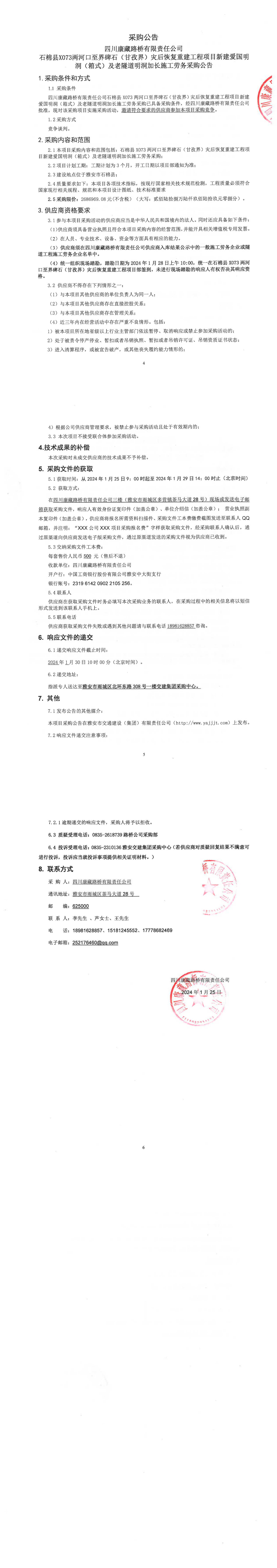 四川康藏路橋有限責任公司國道318名山區(qū)黑竹(成都界)至雨城區(qū)多營段改建工程三標段監(jiān)控中心材料采購(第二次)采購公告
