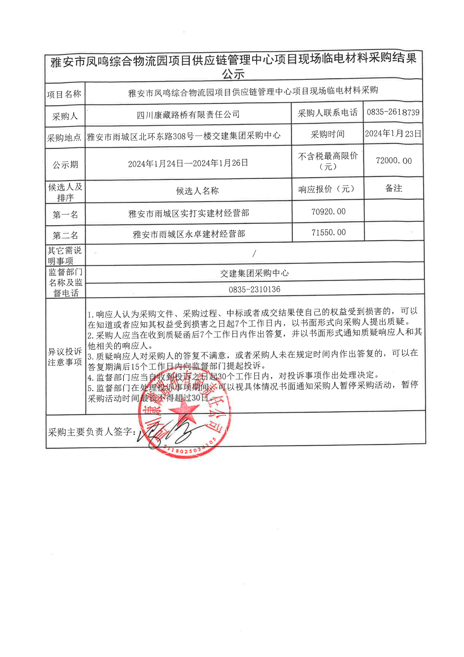 四川康藏路橋有限責任公司雅安市鳳鳴綜合物流園項目供應鏈管理中心項目現(xiàn)場臨電材料采購結果公示