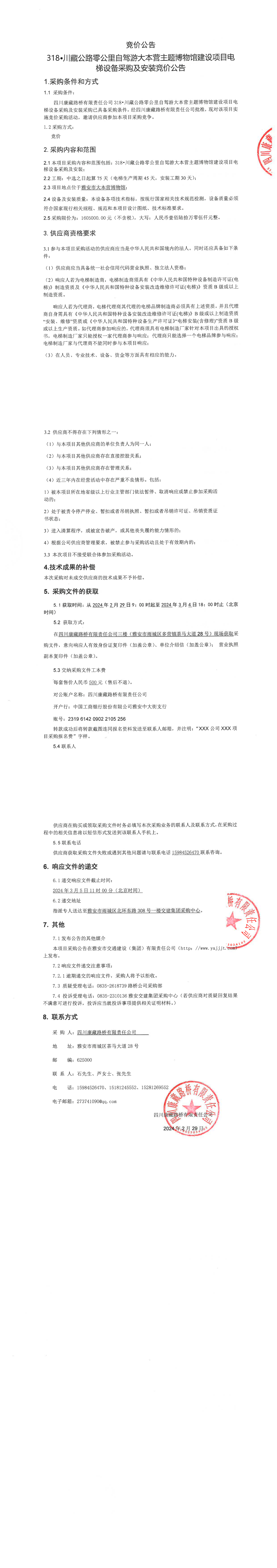 四川康藏路橋有限責任公司318·川藏公路零公里自駕游大本營主題博物館建設項目電梯設備采購及安裝競價公告