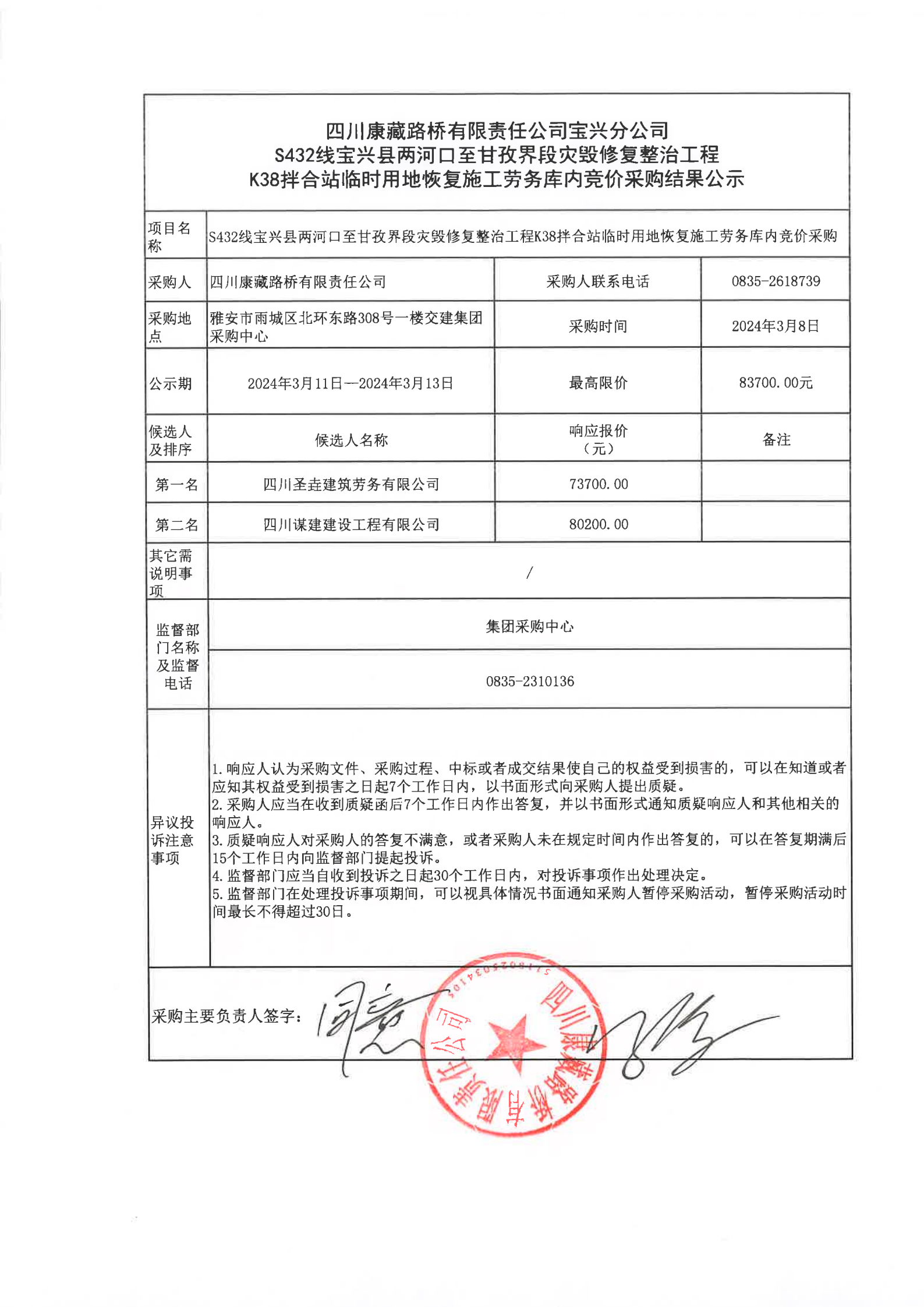 四川康藏路橋有限責任公司寶興分公司S432線寶興縣兩河口至甘孜界段災(zāi)毀修復(fù)整治工程K38拌合站臨時用地恢復(fù)施工勞務(wù)庫內(nèi)競價采購結(jié)果公示