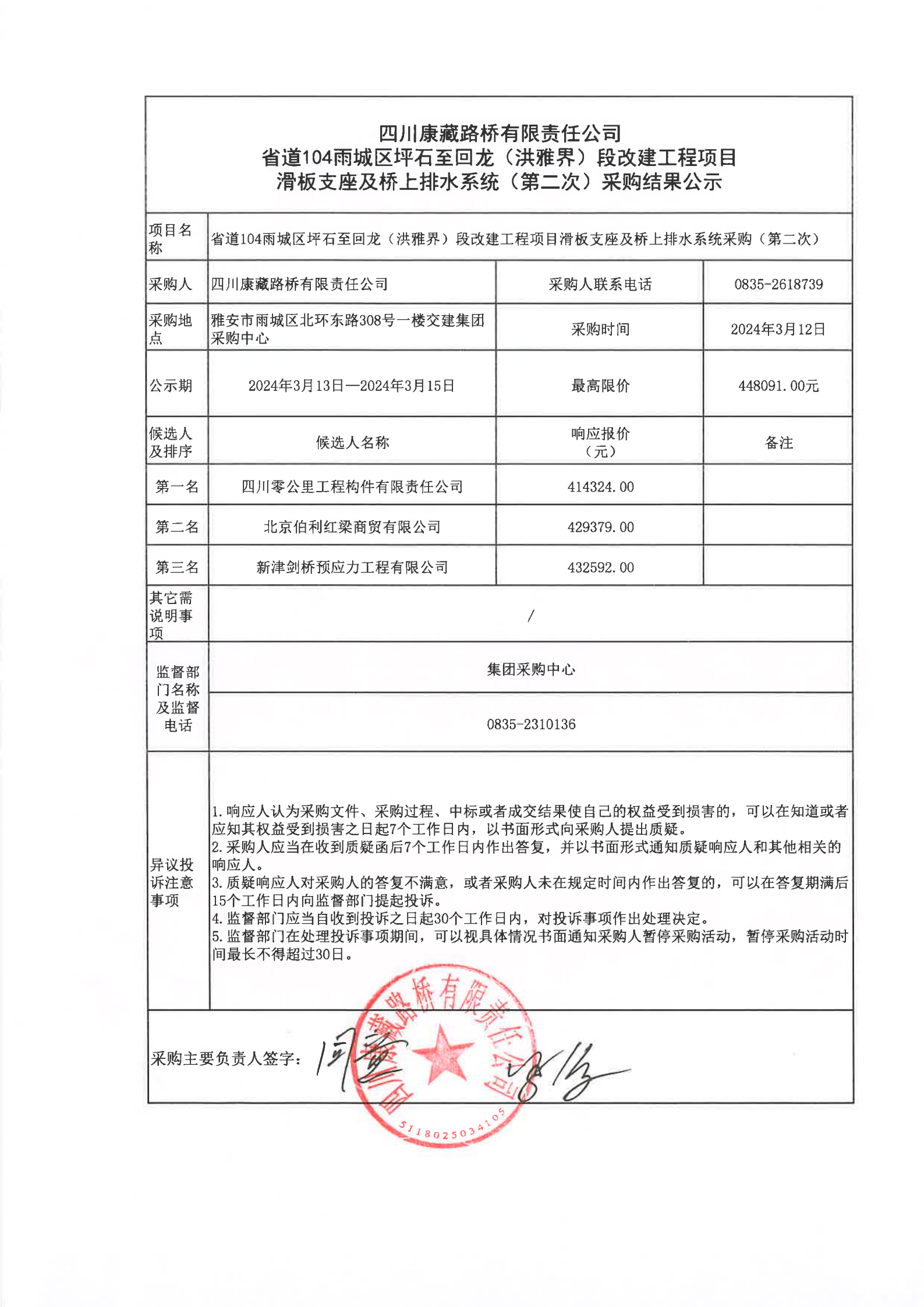 四川康藏路橋有限責任公司省道104雨城區(qū)坪石至回龍(洪雅界)段改建工程項目滑板支座及橋上排水系統(tǒng)(第二次)采購結果公示