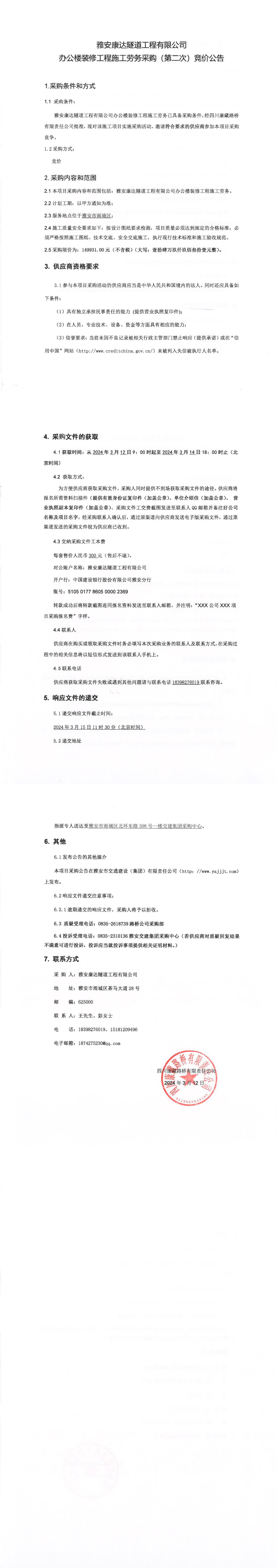 雅安康達(dá)隧道工程有限公司辦公樓裝修工程施工勞務(wù)競(jìng)價(jià)采購(第二次)公告