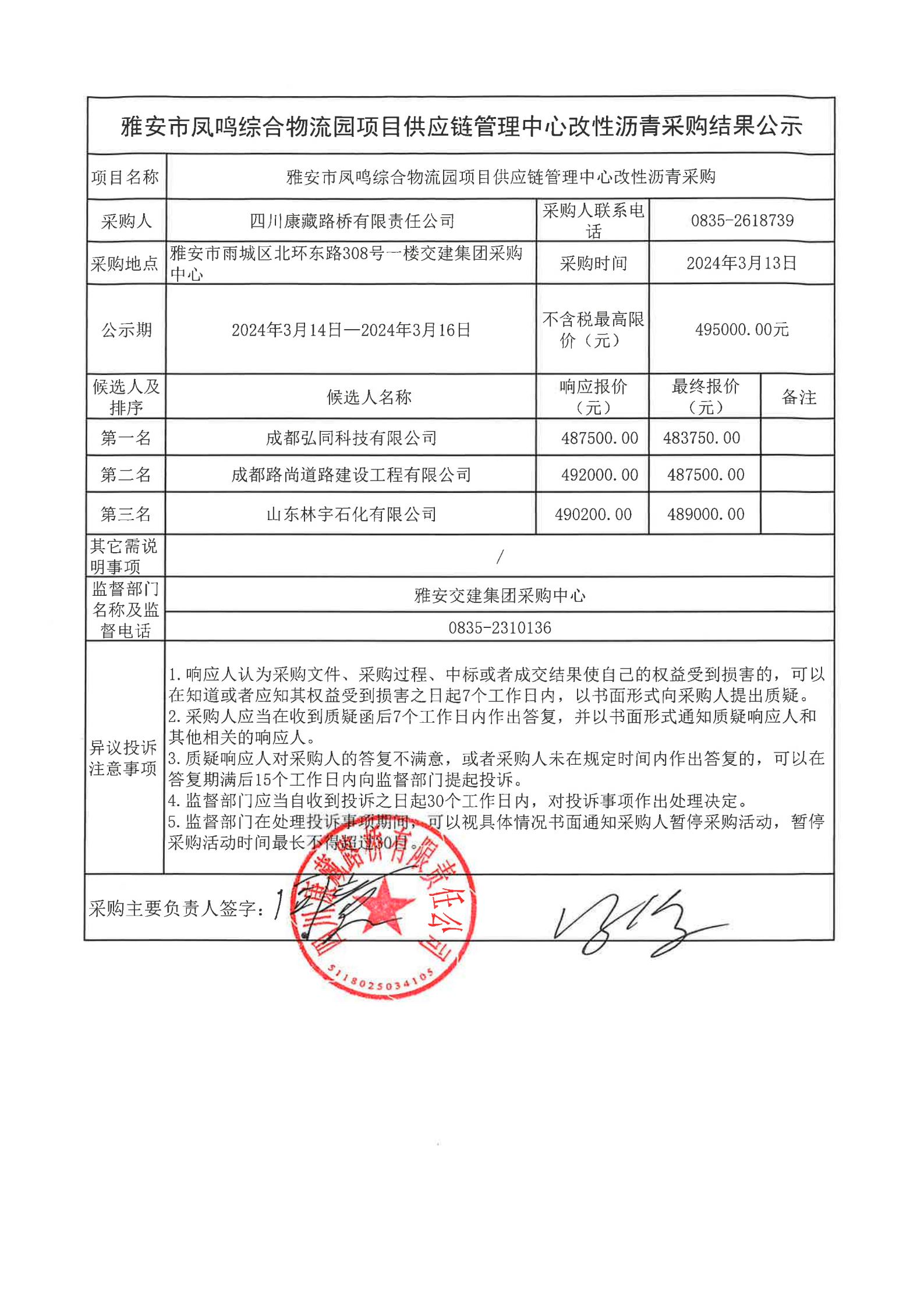 四川康藏路橋有限責(zé)任公司雅安市鳳鳴綜合物流園項(xiàng)目供應(yīng)鏈管理中心改性瀝青采購結(jié)果公示