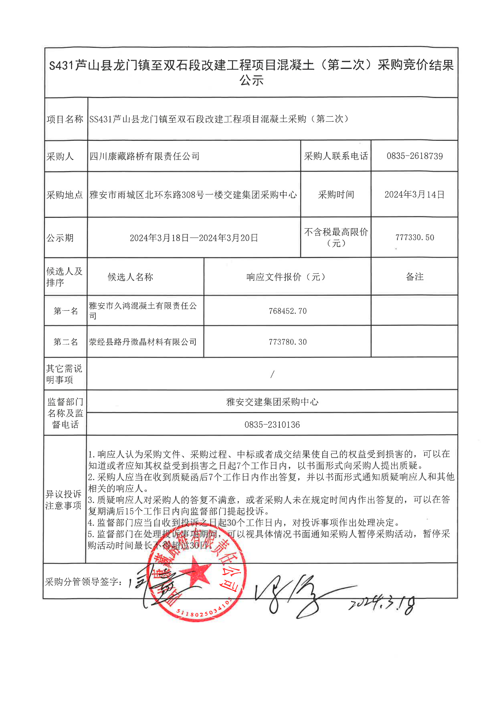 四川康藏路橋有限責(zé)任公司S431蘆山縣龍門鎮(zhèn)至雙石段改建工程項(xiàng)目混凝土(第二次)采購競(jìng)價(jià)結(jié)果公示