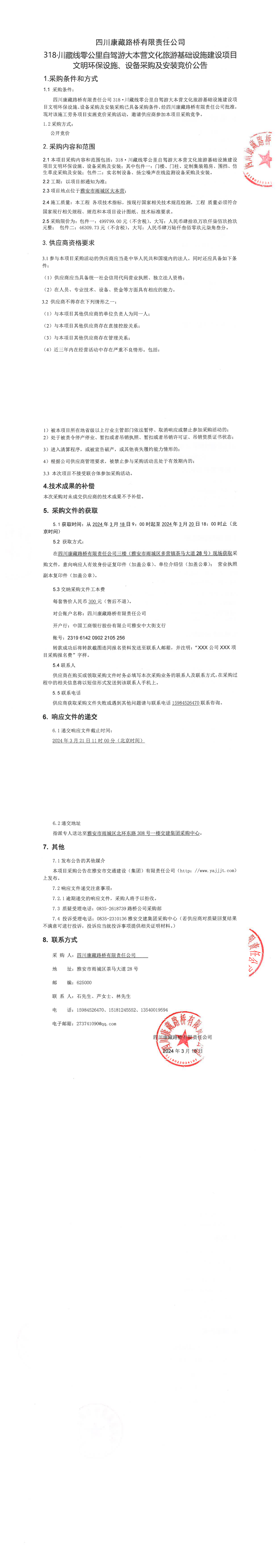 四川康藏路橋有限責(zé)任公司318·川藏公路零公里自駕游大本營文化旅游基礎(chǔ)設(shè)施建設(shè)項(xiàng)目文明環(huán)保設(shè)施、設(shè)備采購及安裝競價(jià)公告