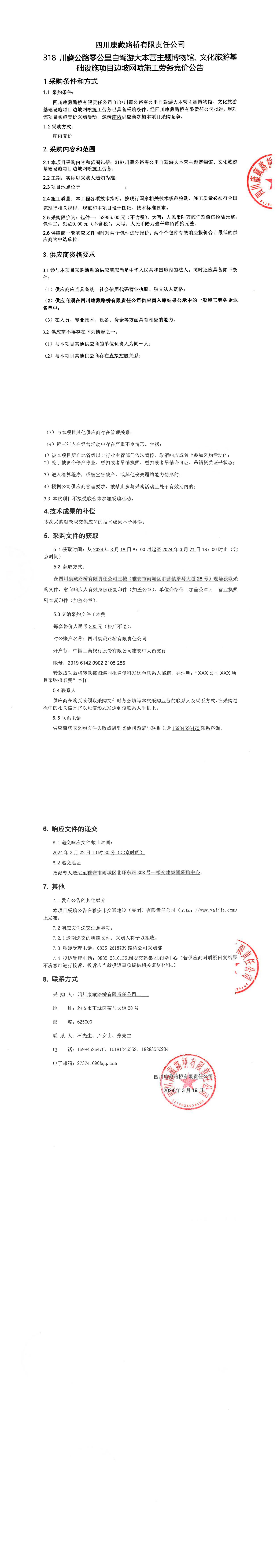 四川康藏路橋有限責任公司318•川藏公路零公里自駕游大本營主題博物館、文化旅游基礎設施項目邊坡網噴施工勞務采購公告