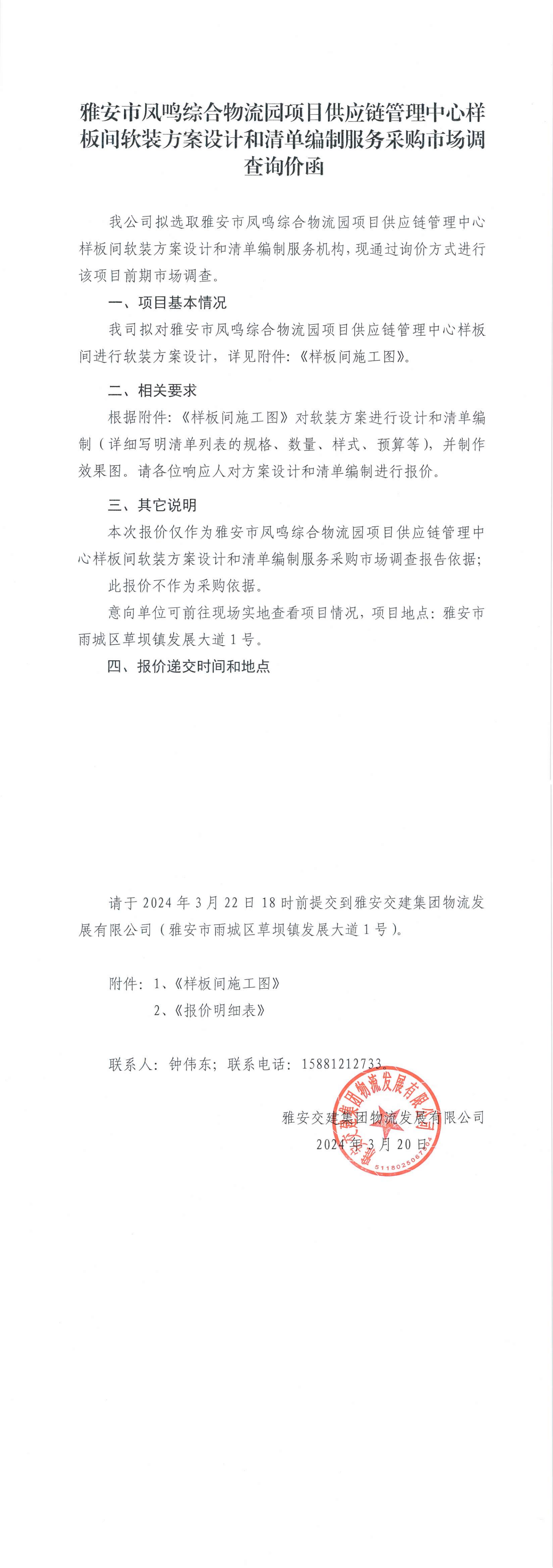 雅安交建集團(tuán)物流發(fā)展有限公司雅安市鳳鳴綜合物流園項目供應(yīng)鏈管理中心樣板間軟裝方案設(shè)計和清單編制服務(wù)采購市場調(diào)查詢價函