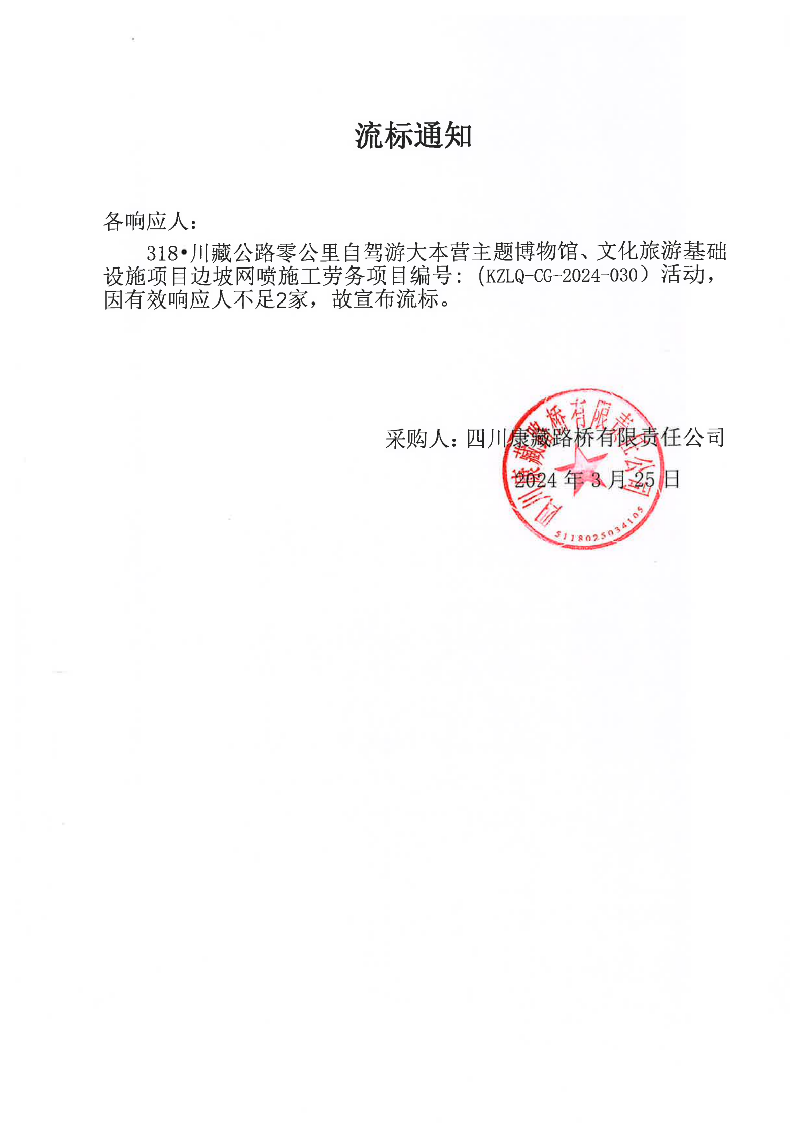 四川康藏路橋有限責(zé)任公司318·川藏公路零公里自駕游大本營主題博物館、文化旅游基礎(chǔ)設(shè)施項(xiàng)目邊坡網(wǎng)噴施工勞務(wù)流標(biāo)通知