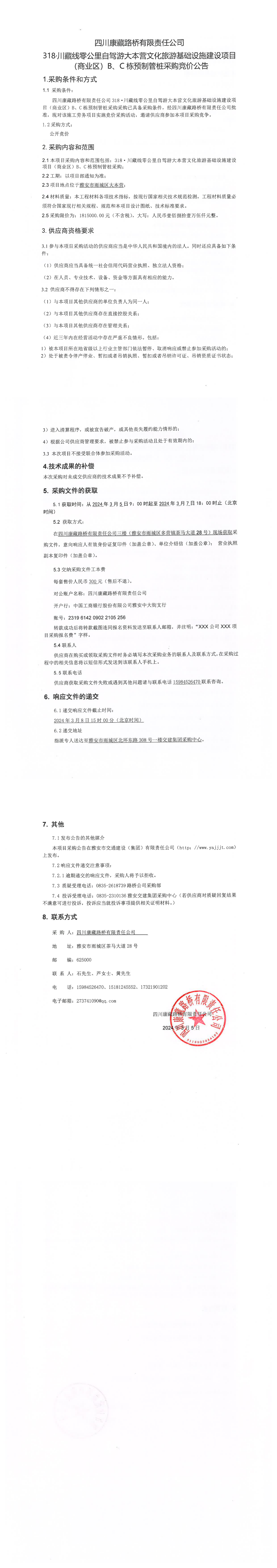 四川康藏路橋有限責(zé)任公司318·川藏公路零公里自駕游大本營(yíng)文化旅游基礎(chǔ)設(shè)施建設(shè)項(xiàng)目(商業(yè)區(qū))B\C棟預(yù)制管樁采購競(jìng)價(jià)公告