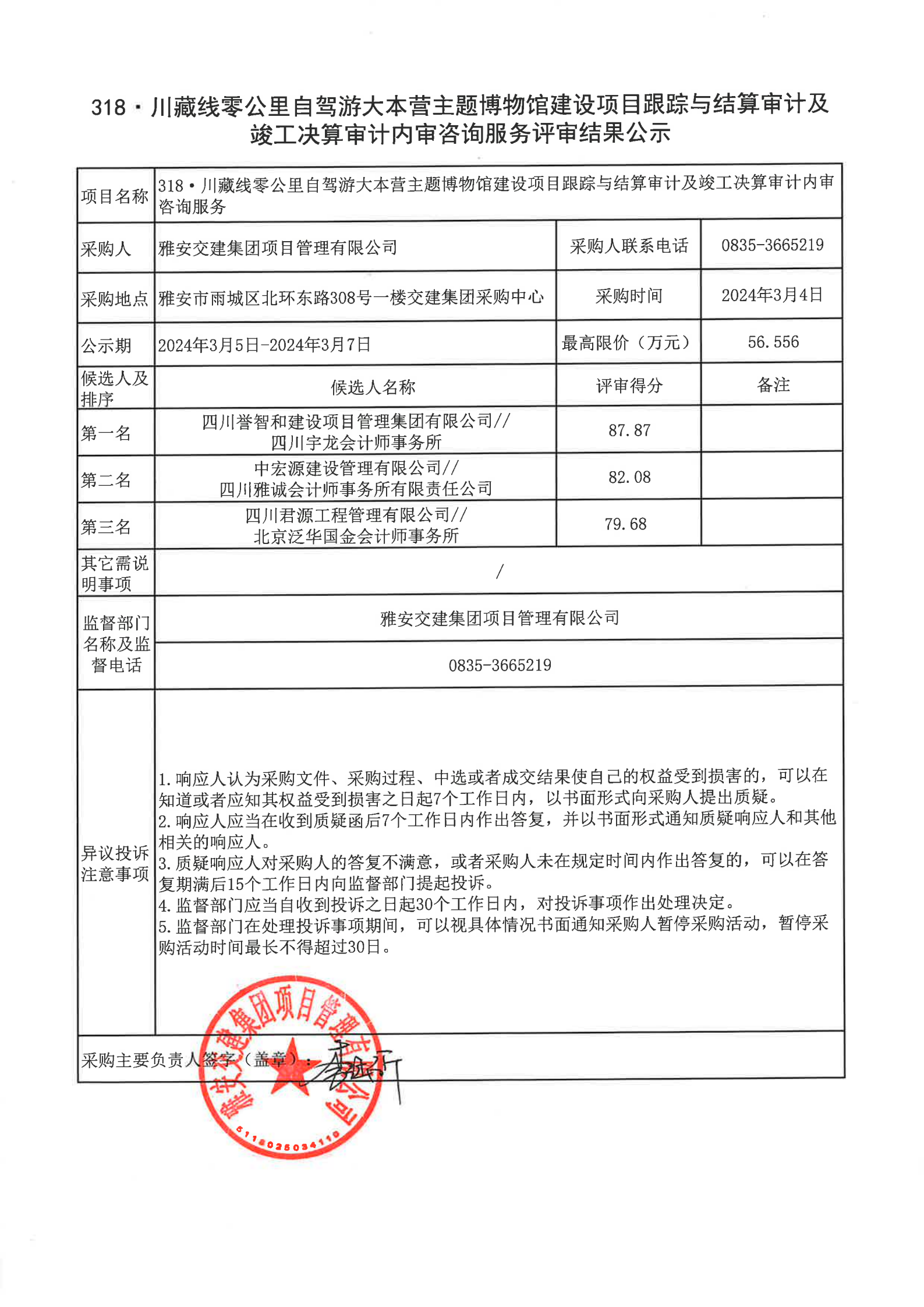雅安交建集團(tuán)項(xiàng)目管理有限公司318·川藏線零公里自駕游大本營(yíng)主題博物館建設(shè)項(xiàng)目跟蹤與結(jié)算審計(jì)及竣工決算審計(jì)內(nèi)審咨詢服務(wù)評(píng)審結(jié)果公示