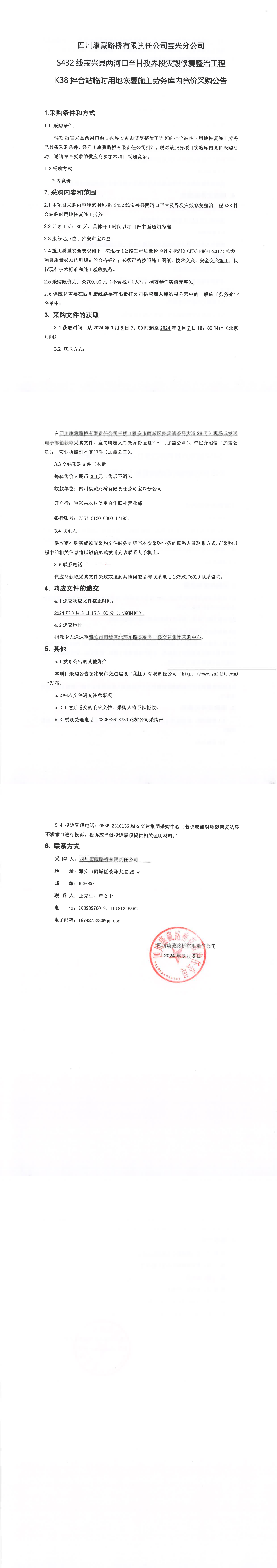 四川康藏路橋有限責任公司S432線寶興縣兩河口至甘孜界段災毀修復整治工程K38拌合站臨時用地恢復施工勞務庫內(nèi)競價采購公告