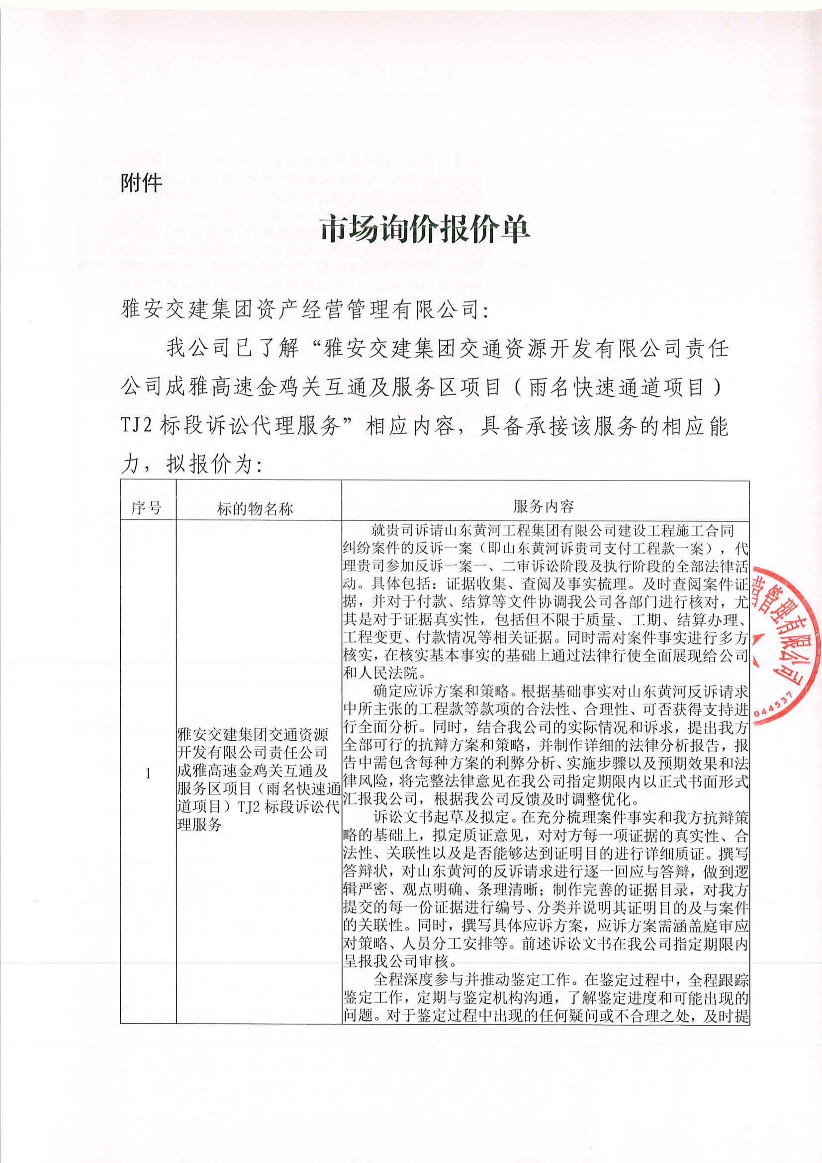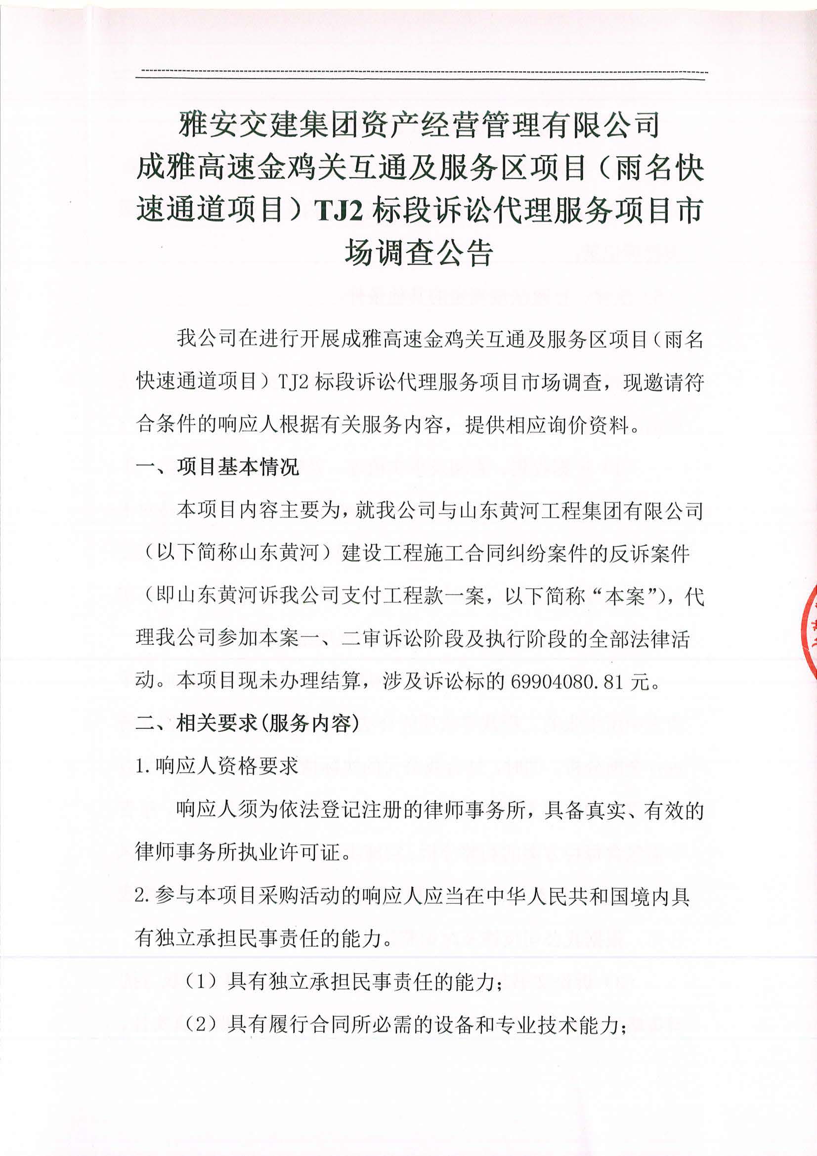 雅安交建集團(tuán)資產(chǎn)經(jīng)營管理有限公司成雅高速金雞關(guān)互通及服務(wù)區(qū)項(xiàng)目(雨名快速通道項(xiàng)目)TJ2標(biāo)段訴訟代理服務(wù)項(xiàng)目市場調(diào)查公告